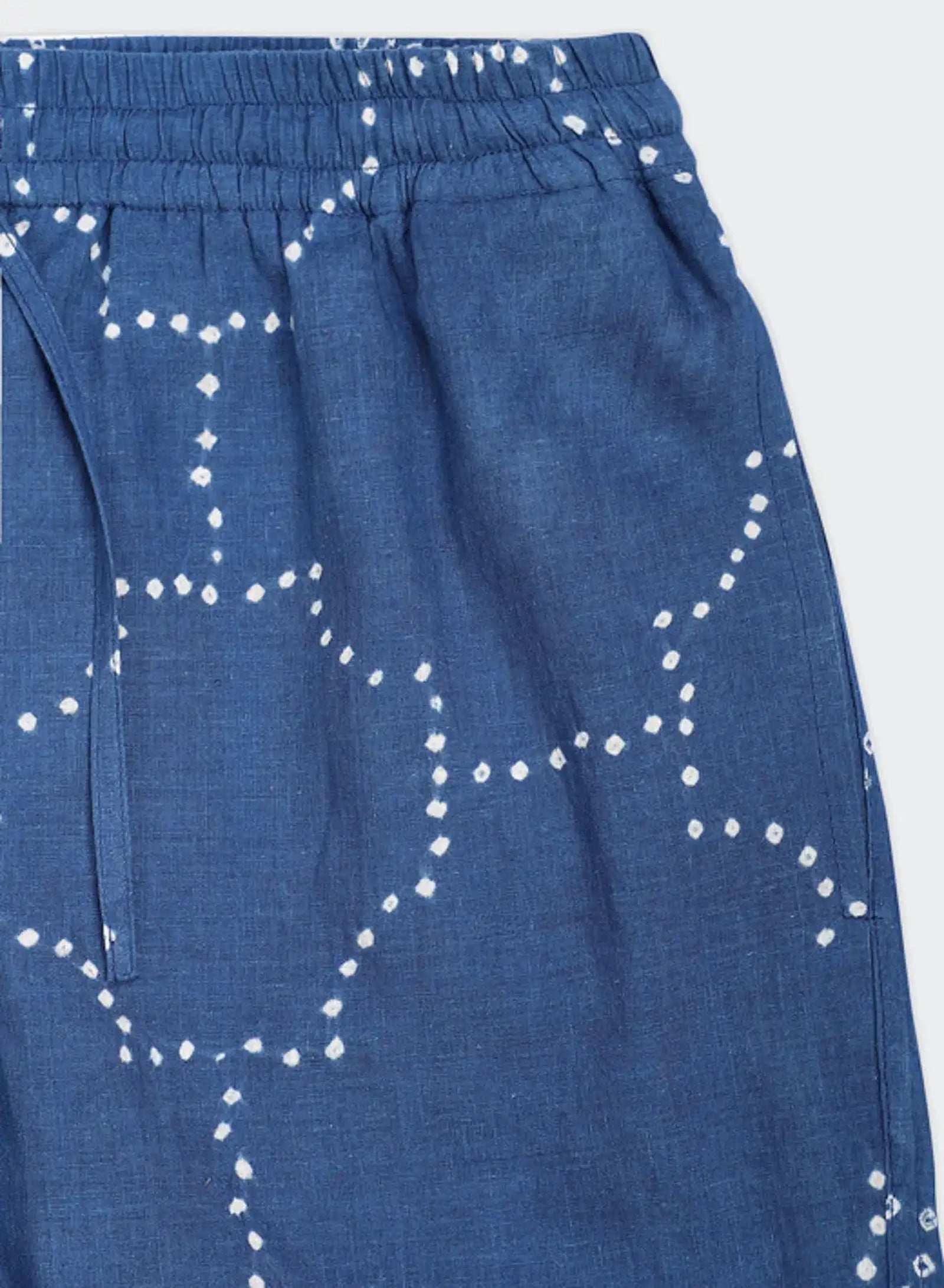 Elastic waist drawstring beach shorts with side pockets and nylon netting interior.