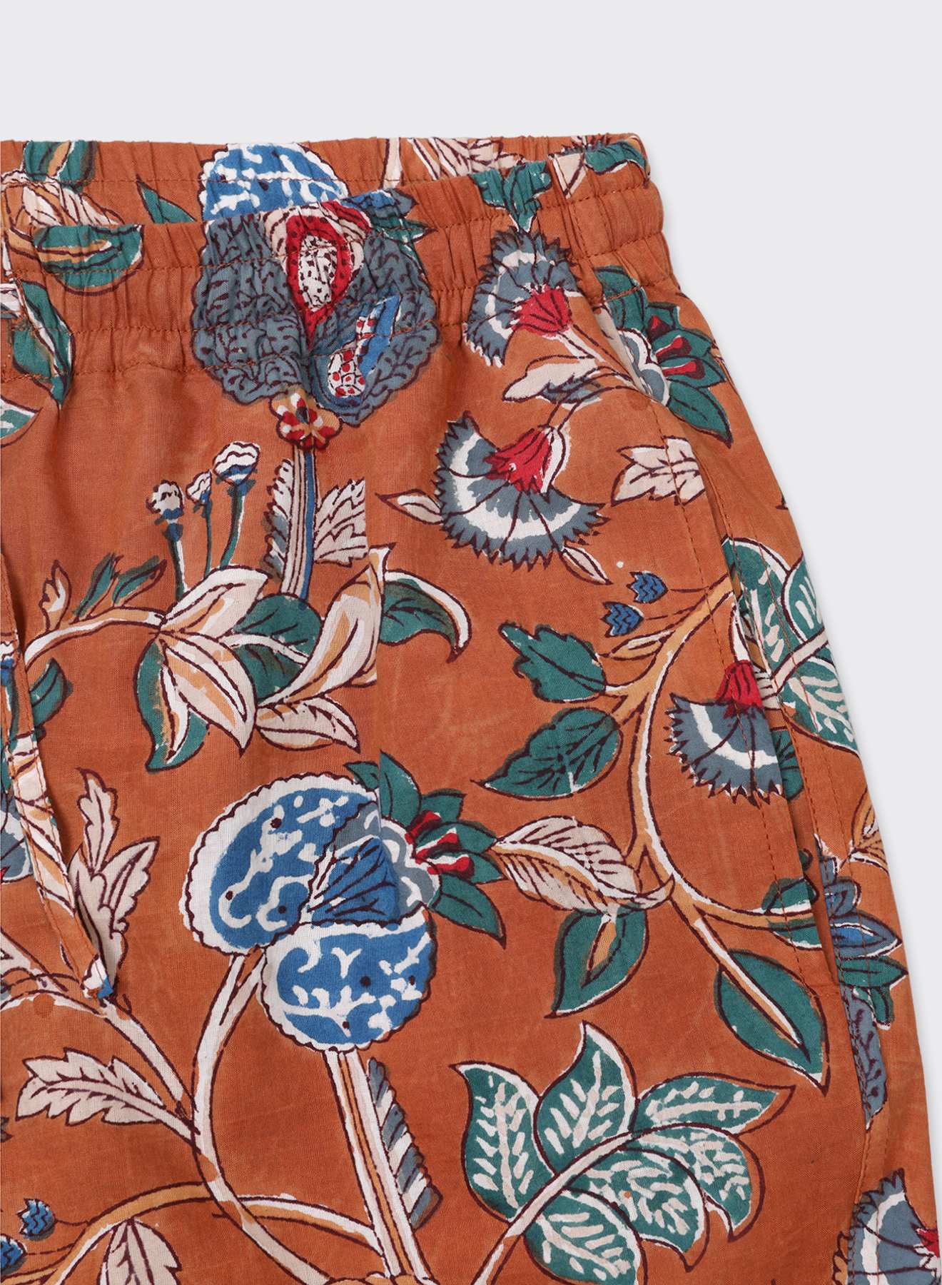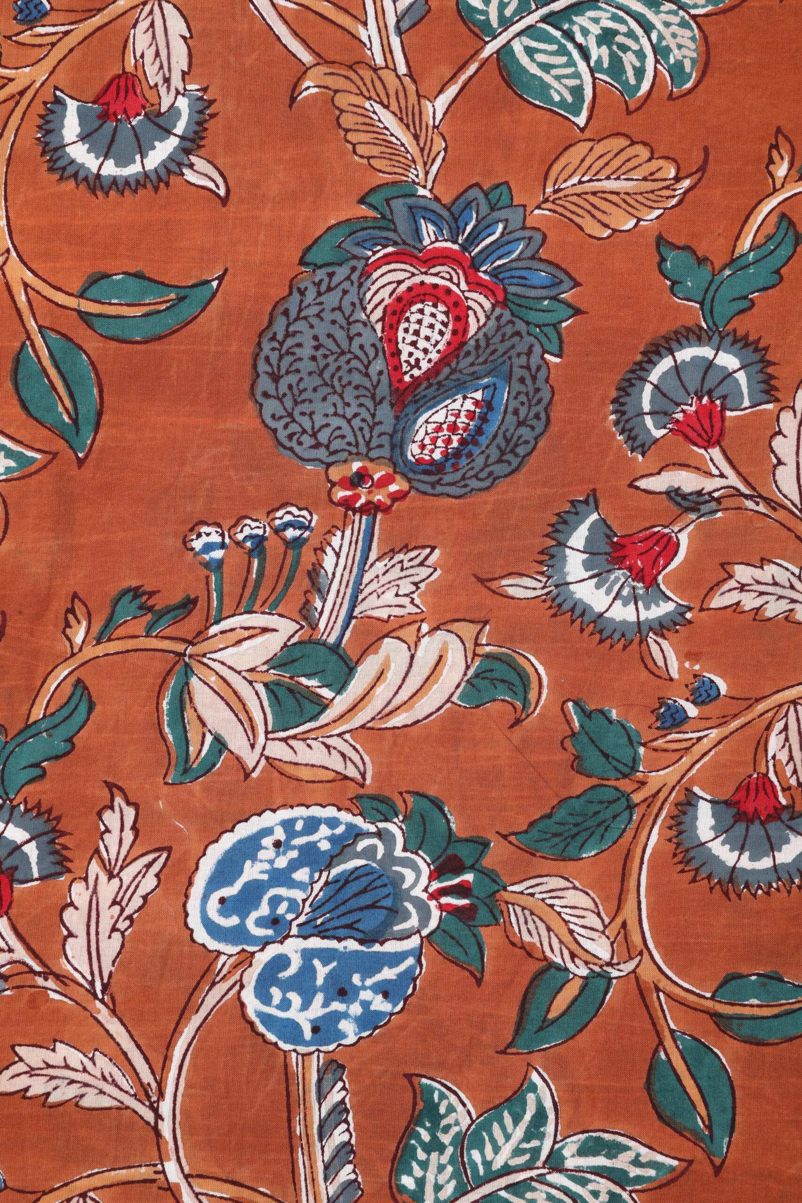 We print these fabrics with hand-carved wooden blocks, each block carrying a fragment of the larger pattern. Every colour is pressed in a separate pass, aligned by eye and hand with practiced precision. We work with master printers in Rajasthan, including Anokhi and Titanwala, and often turn to natural dyes for their depth and warmth. As the cloth is printed, the colours settle into the fibres themselves, so the pattern becomes part of the fabric’s character, resting as naturally as the weave around it.