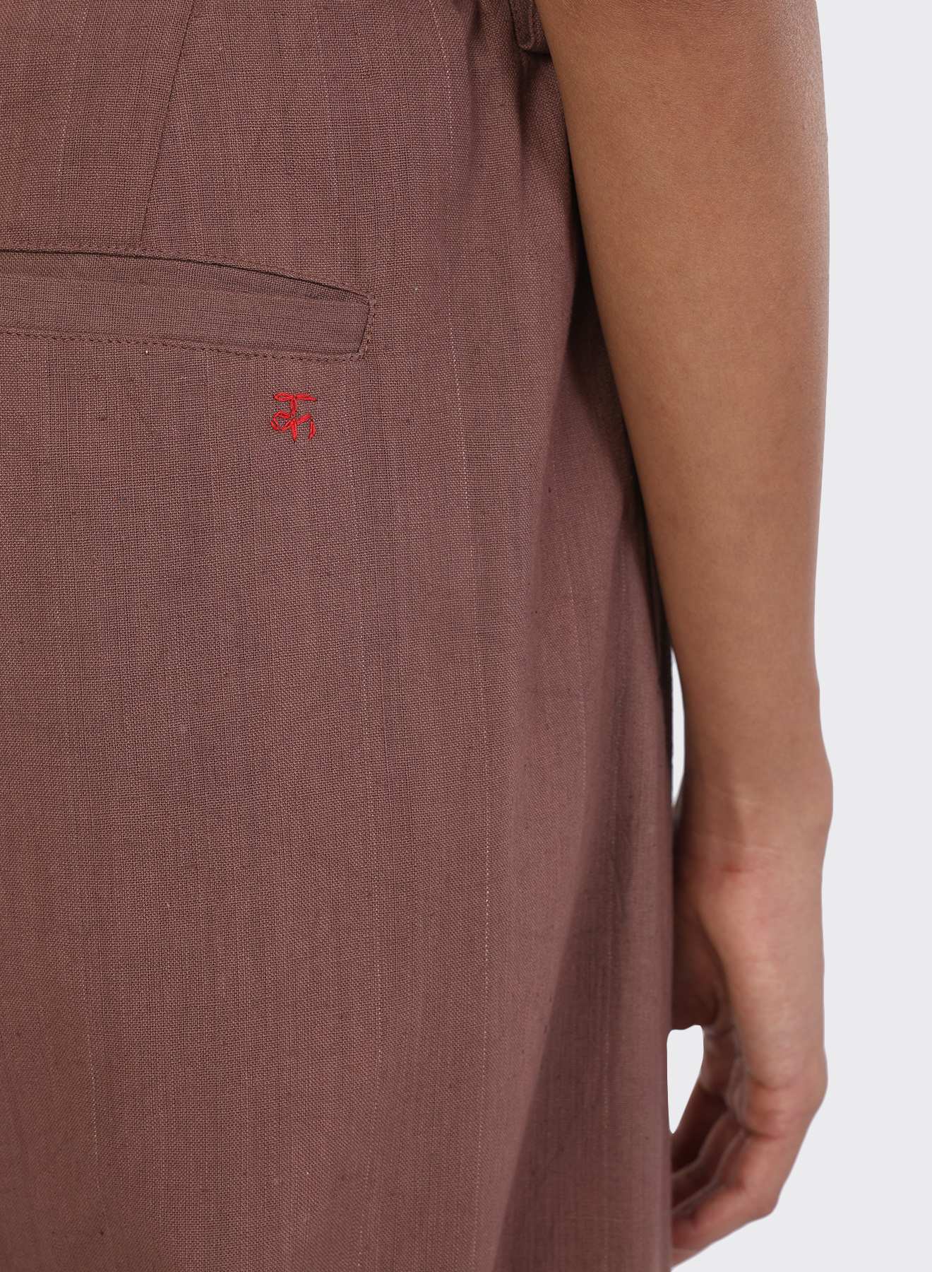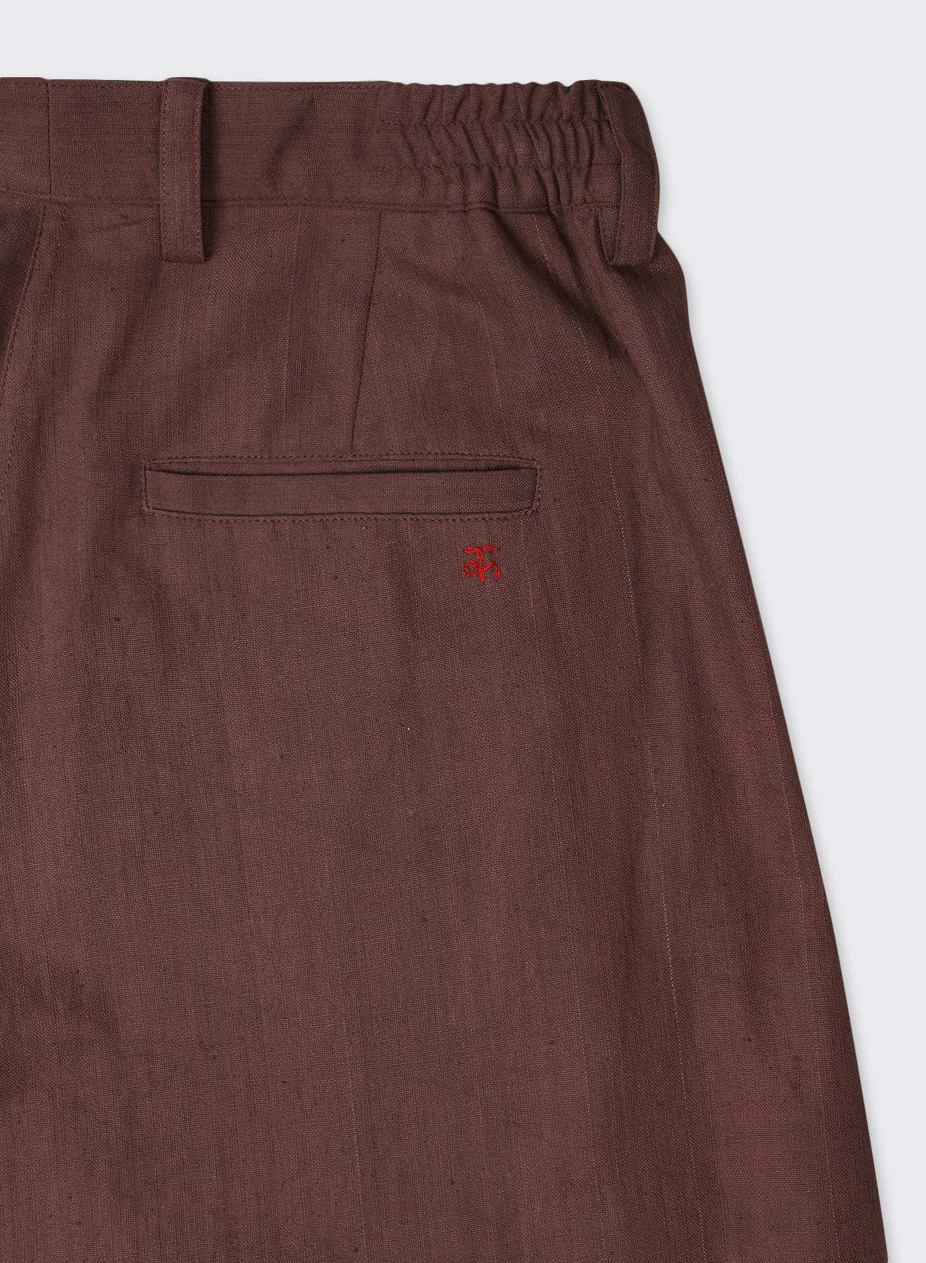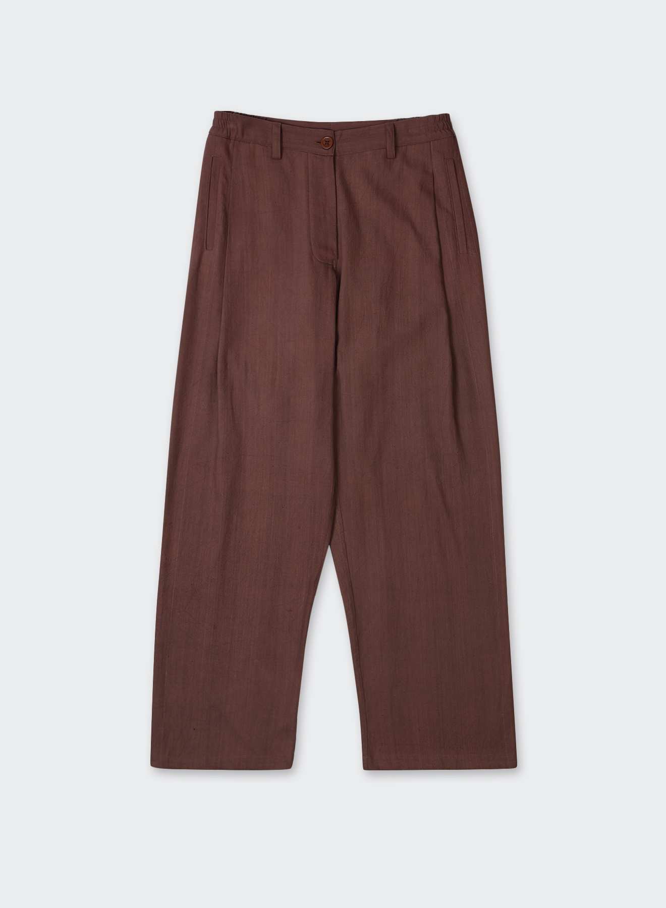 BHARTI is cut with an elastic waist and knife pleats that release into a straight leg. The drawstring gathers the waist while leaving the fall uninterrupted, letting the fabric drop in a clean, even line. Its movement remains fluid, enhanced by the structure at the top.