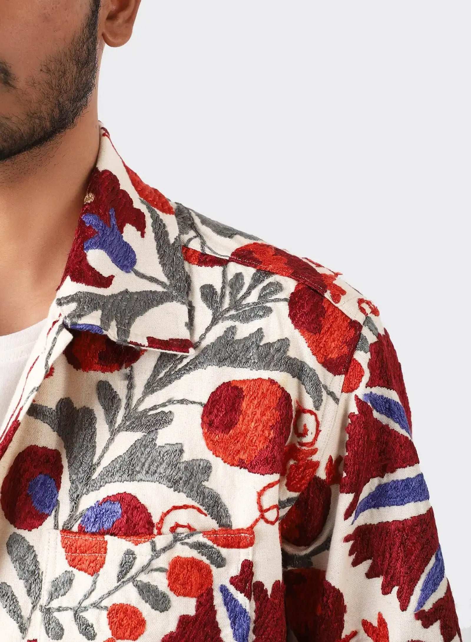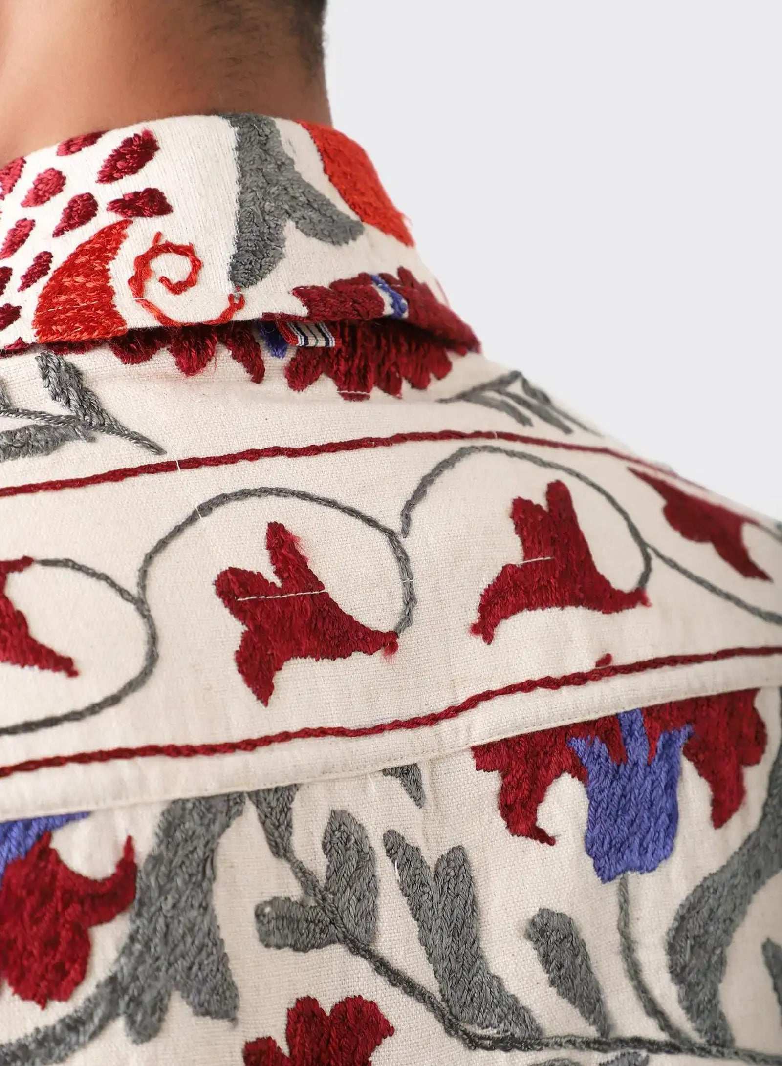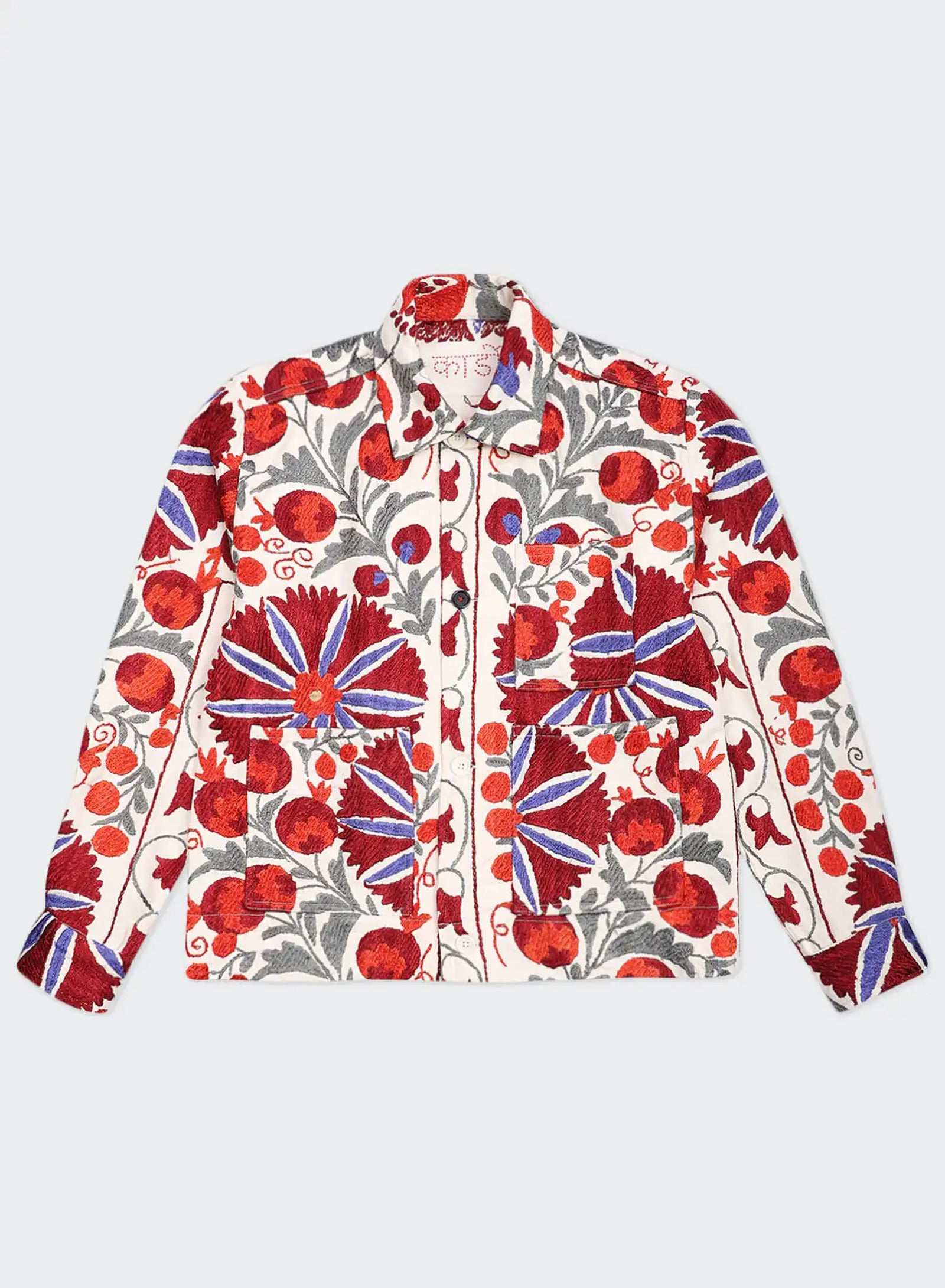 Boxy fit jacket in antique suzani embroidery. Each piece is unique