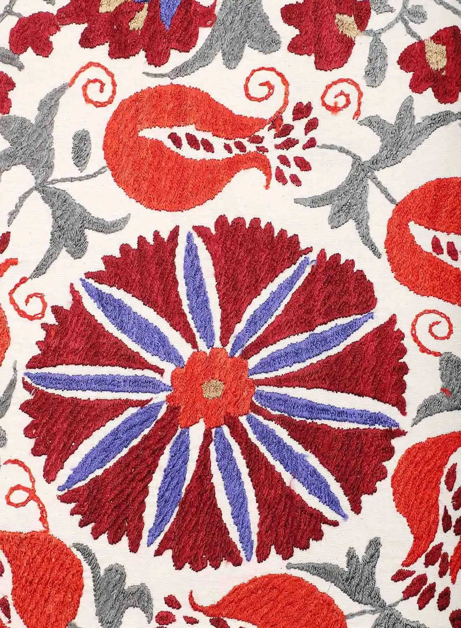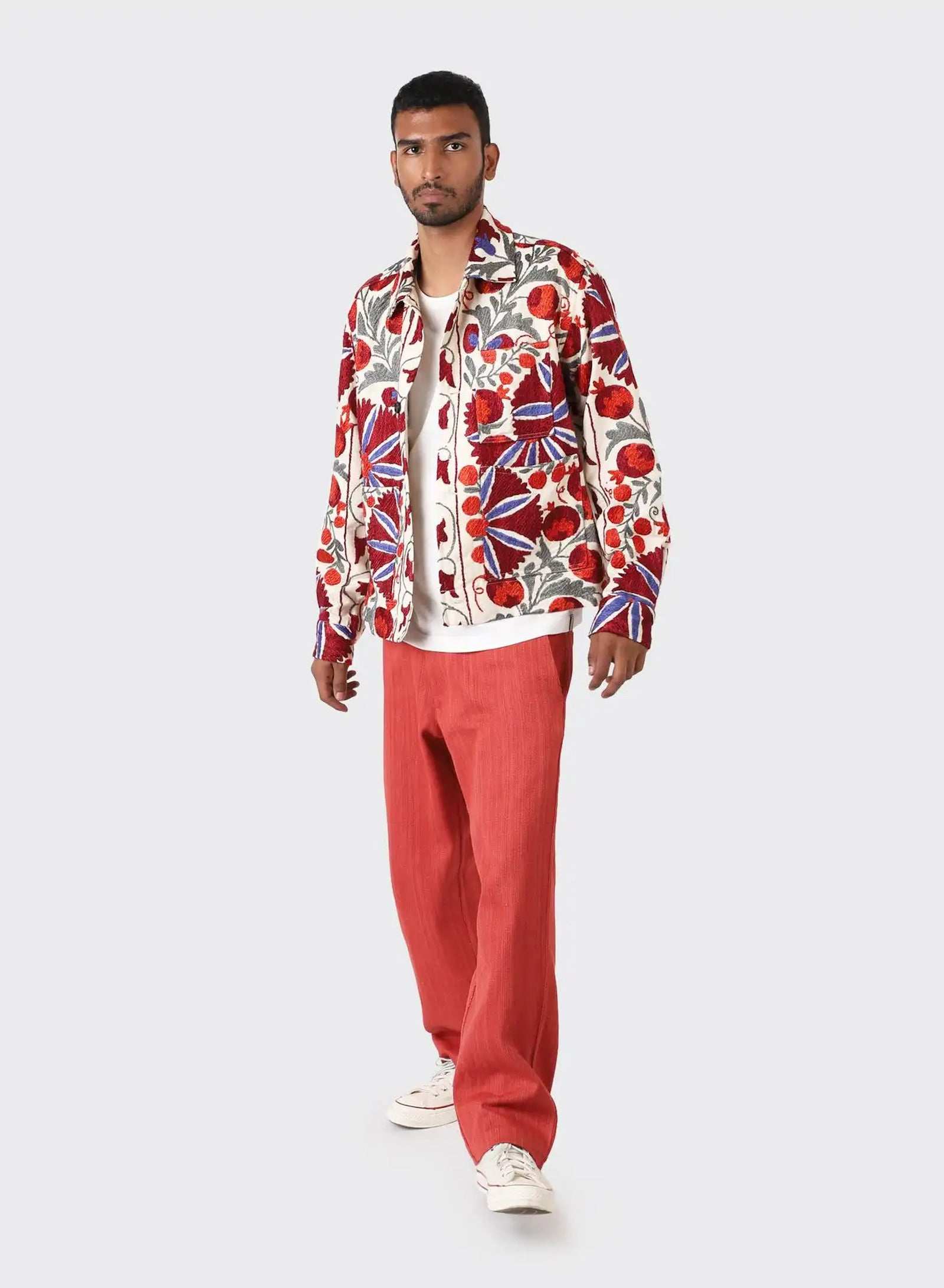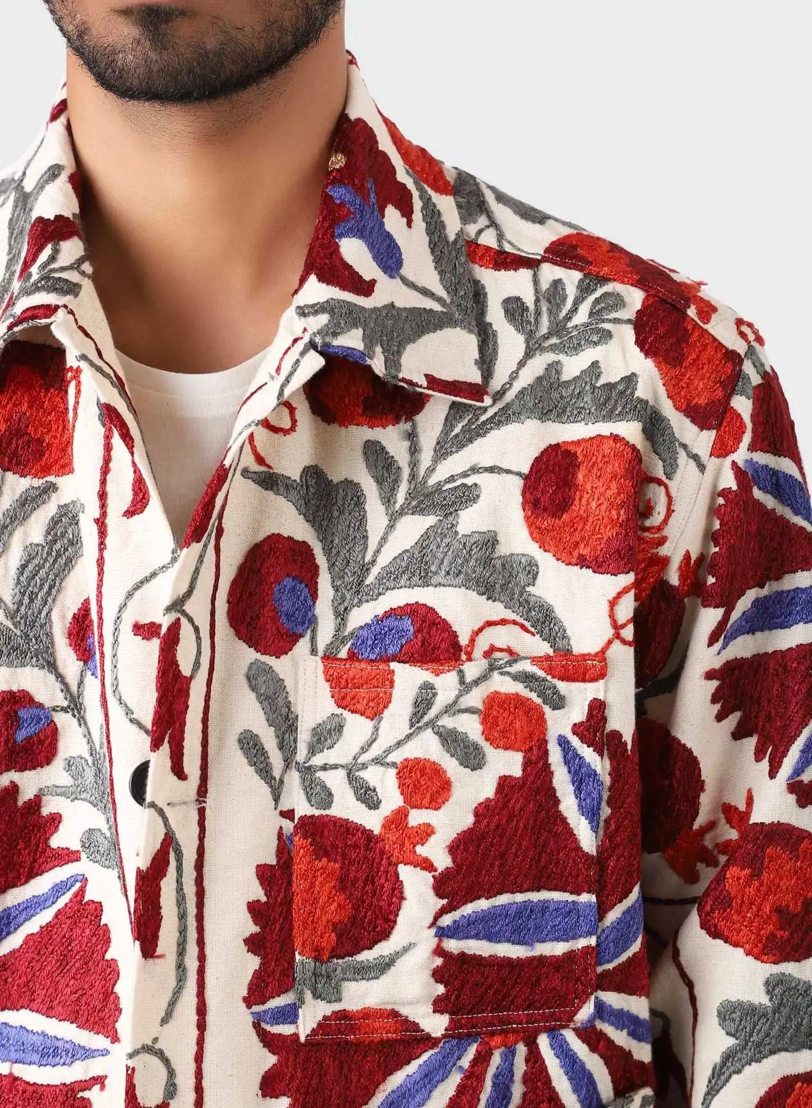 Boxy fit jacket in antique suzani embroidery. Each piece is unique