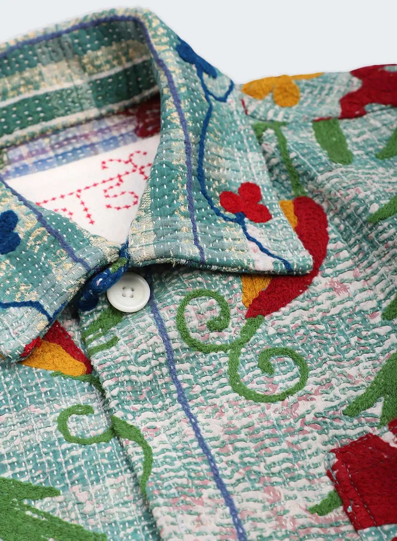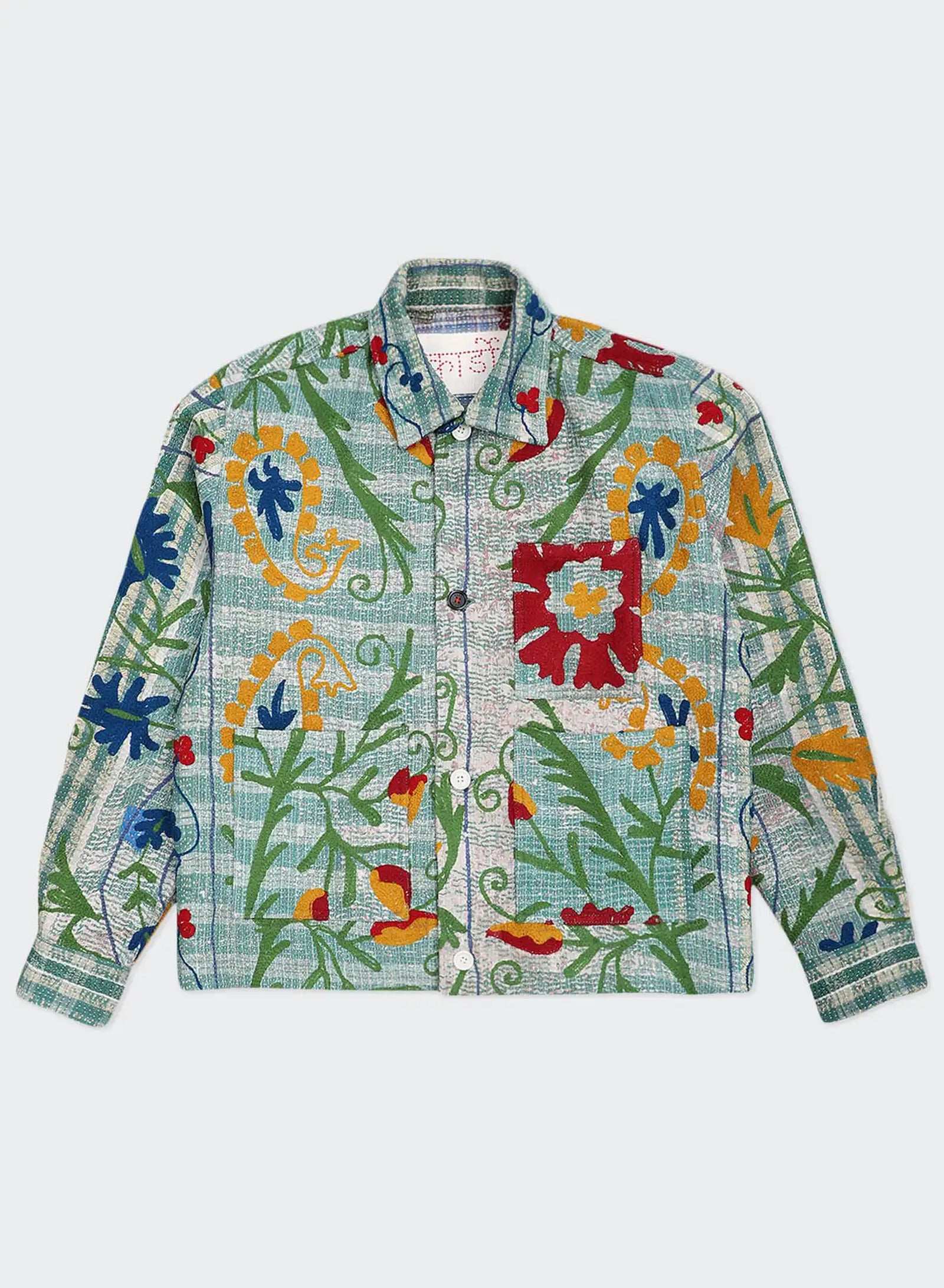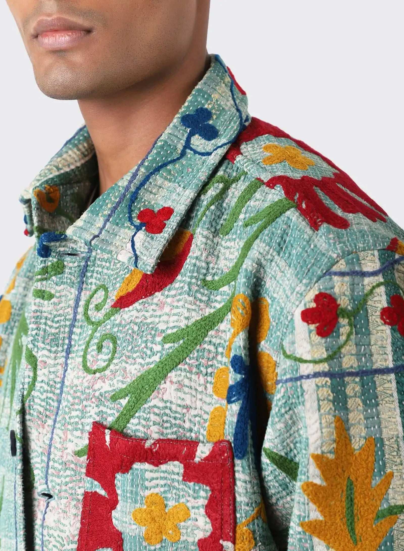 Boxy fit jacket in antique suzani embroidery with kantha detailing. Each piece is unique