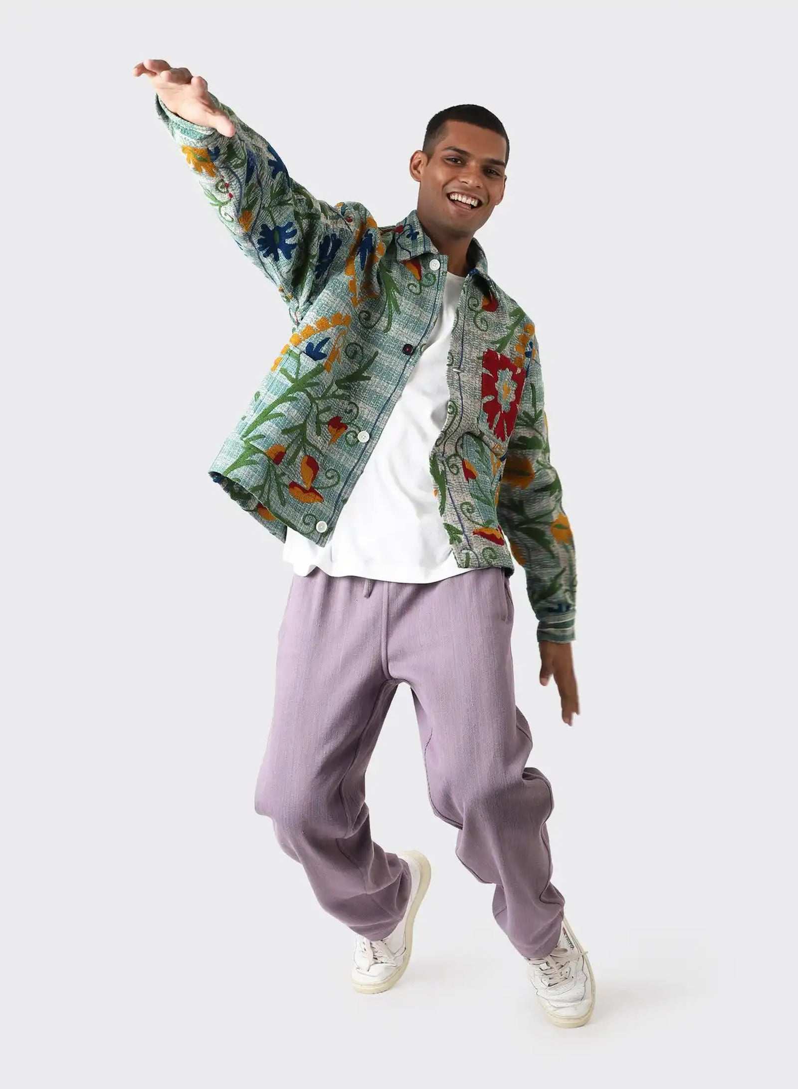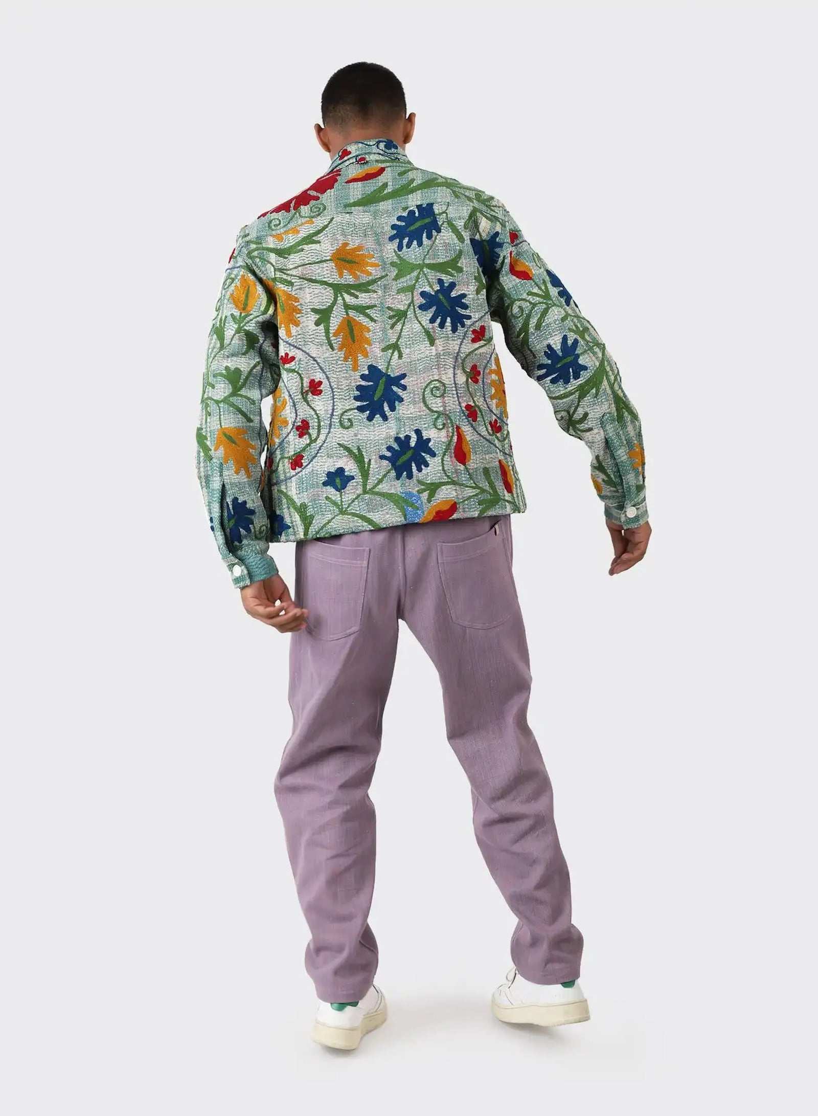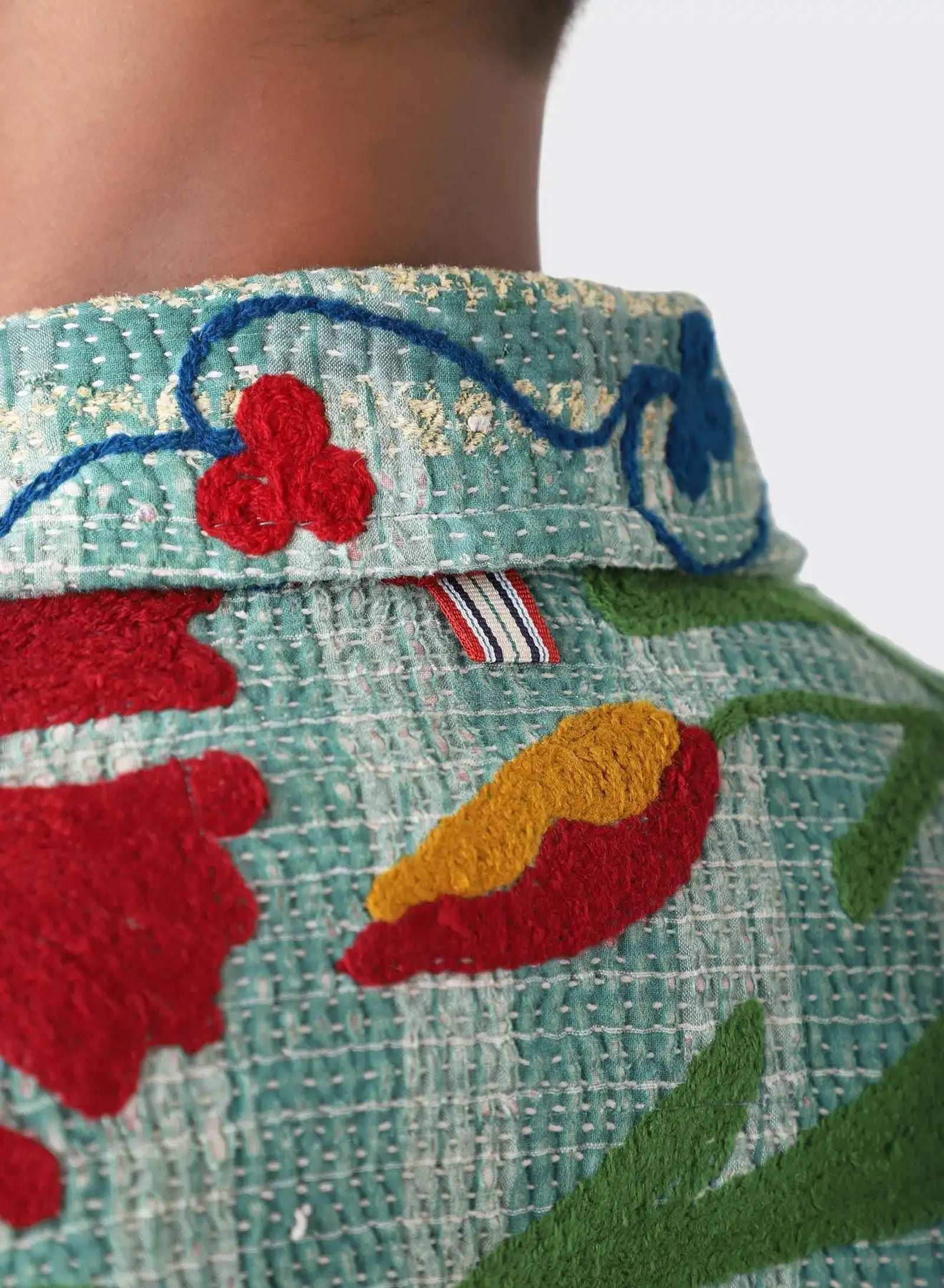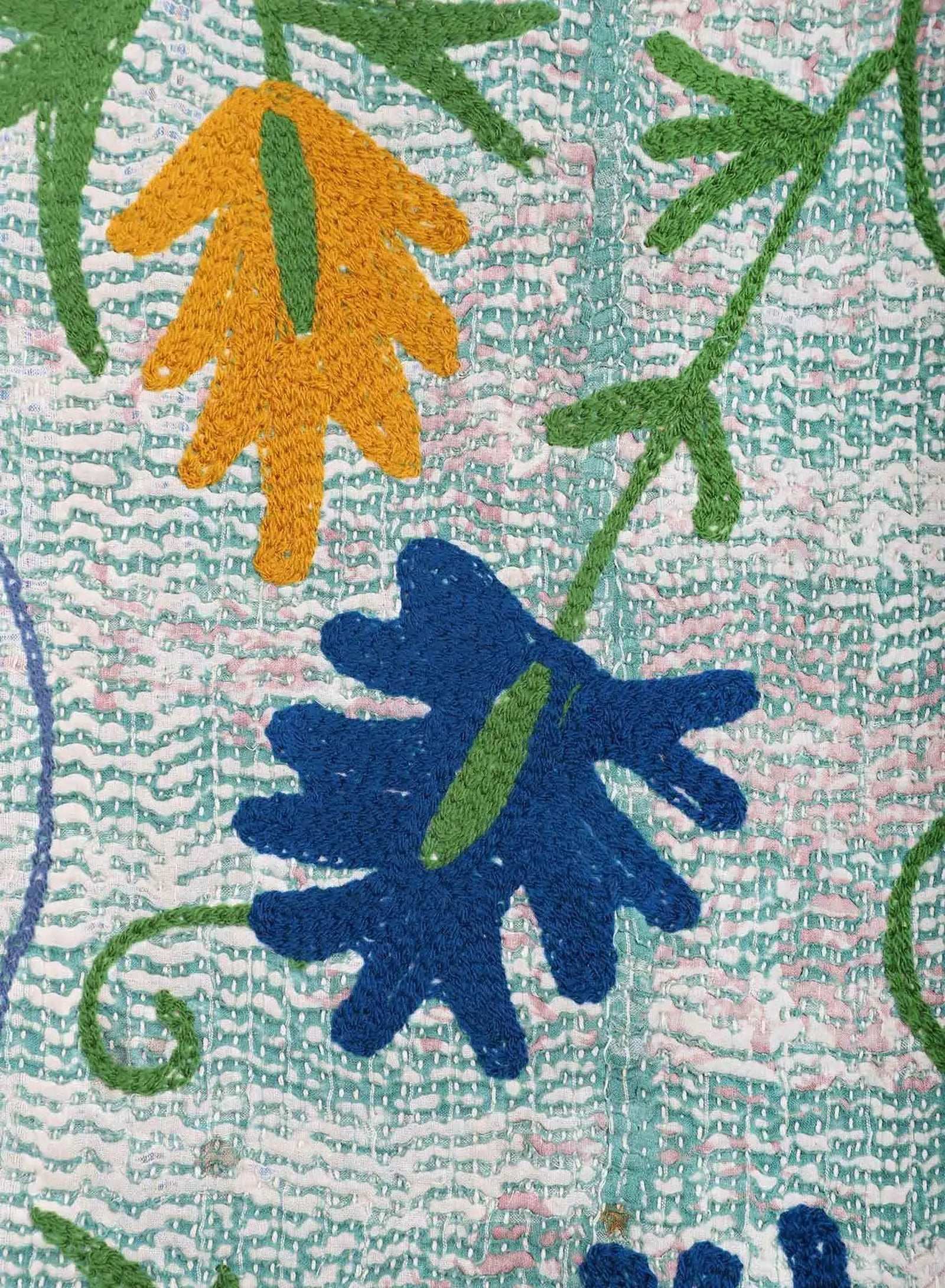 Boxy fit jacket in antique suzani embroidery with kantha detailing. Each piece is unique