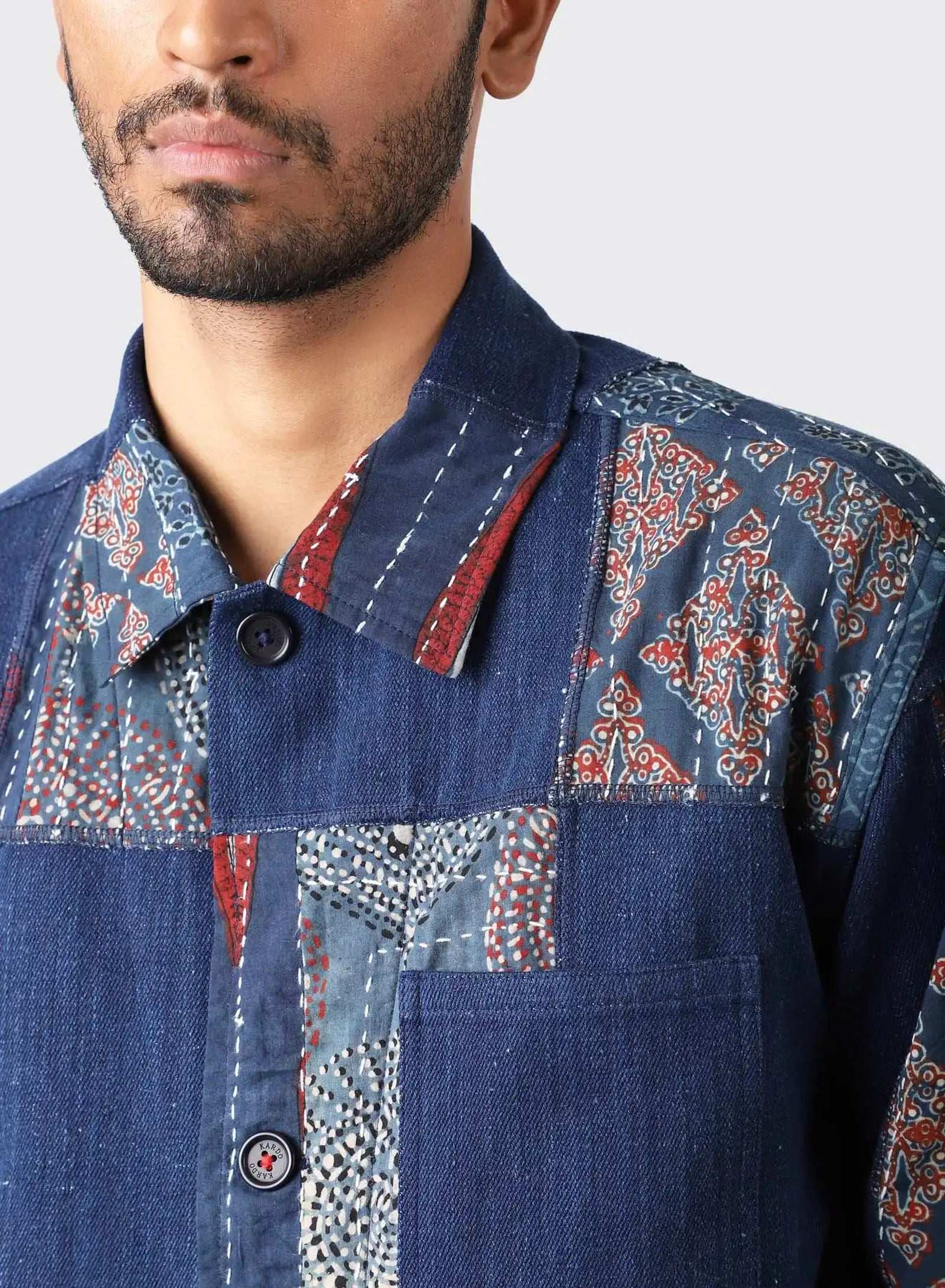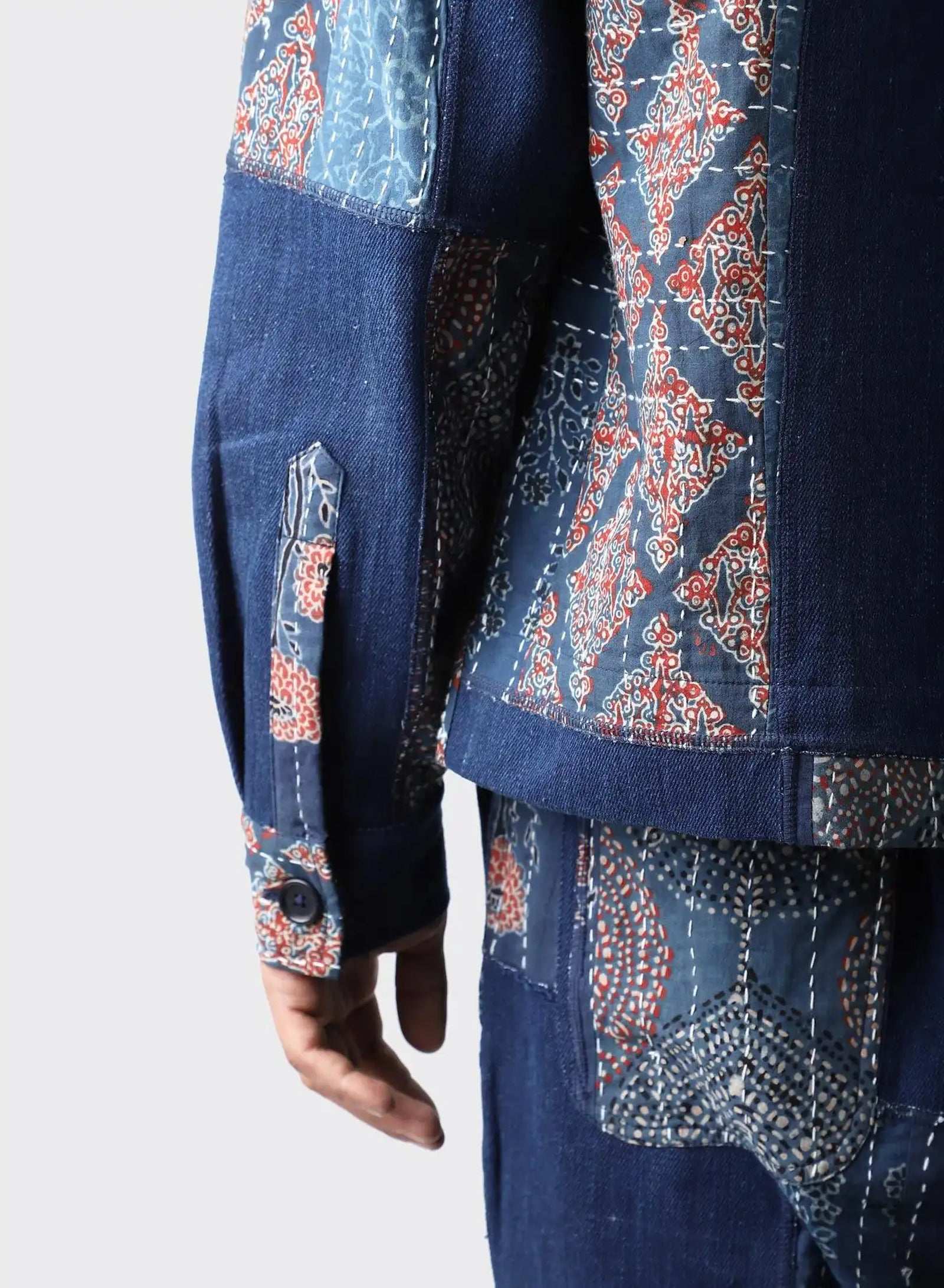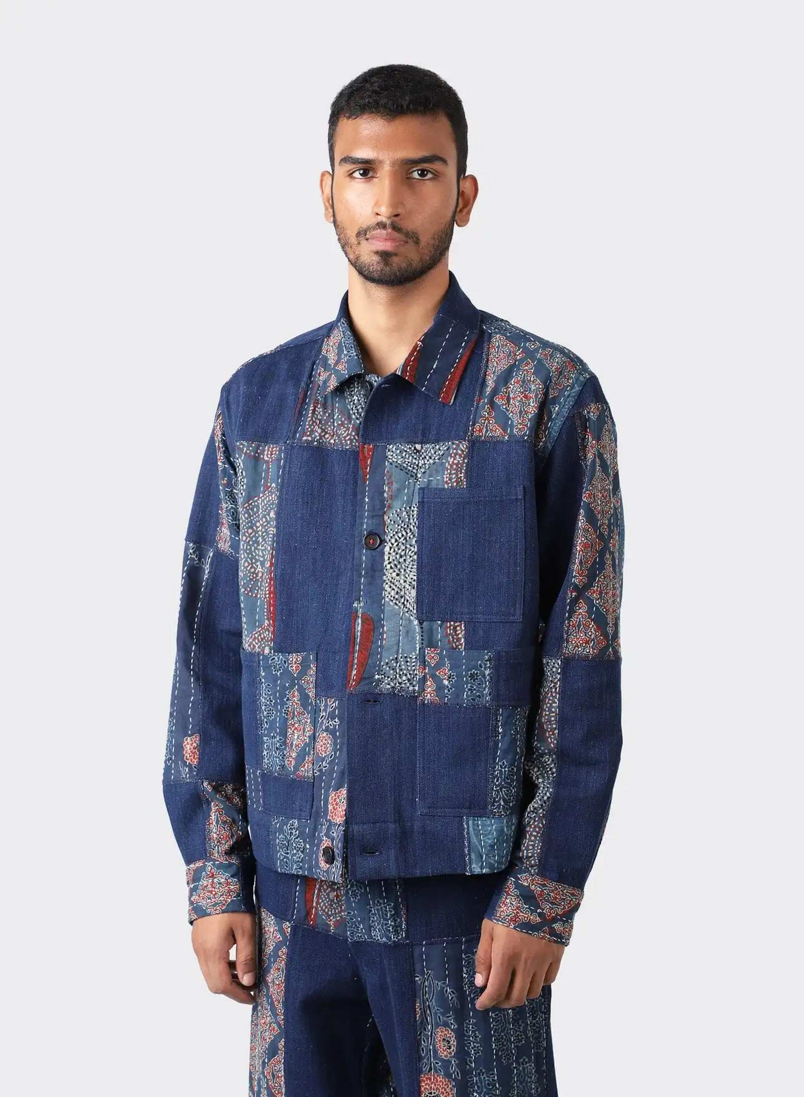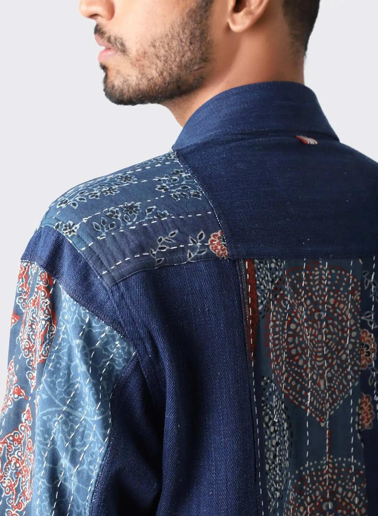 Boxy fit jacket in our handloom denim with kantha patches