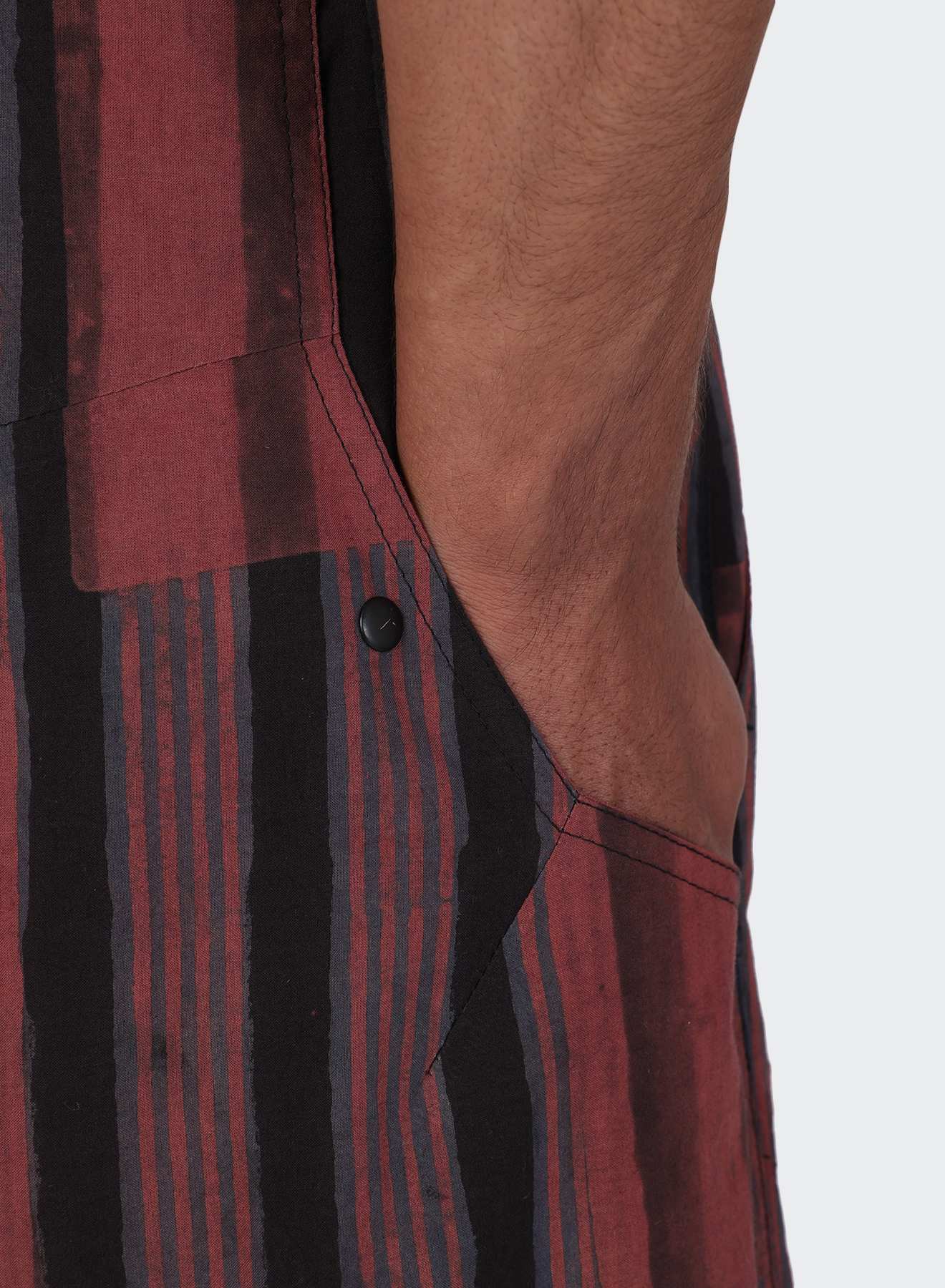 Ajrakh block printing is a centuries-old craft that uses natural dyes and layered resist to create precise geometric patterns. In Ajrakhpur, Gujarat, we work with artisan Sufiyan Khatri and his team, who guide the fabric through many careful stages of printing and dyeing. Each length carries deep, plant-derived colours and patterns that hold their clarity while settling into the softness of the cloth.