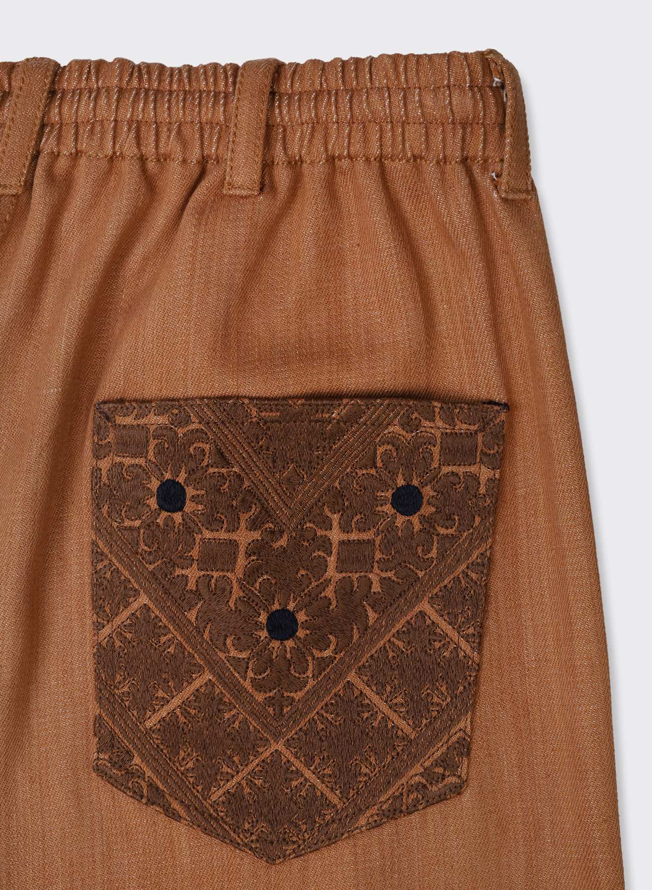 The pockets feature intricate geometric and floral motifs, machine-embroidered by Shabab Ali, a master artisan from Giridih, Jharkhand, with over two decades of expertise.