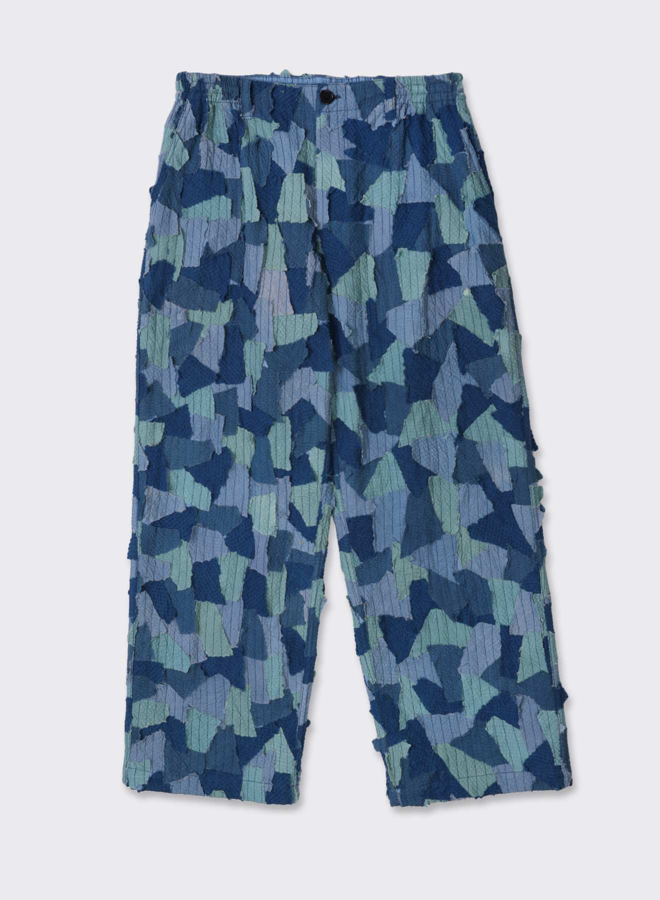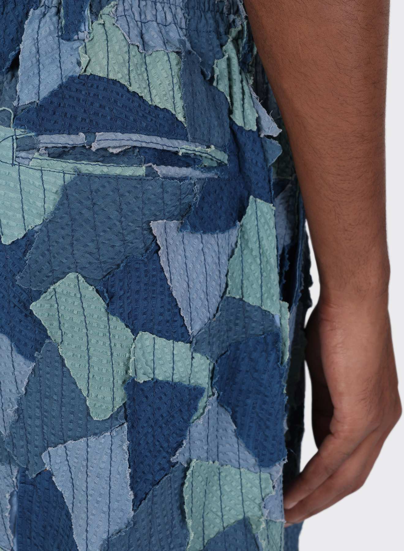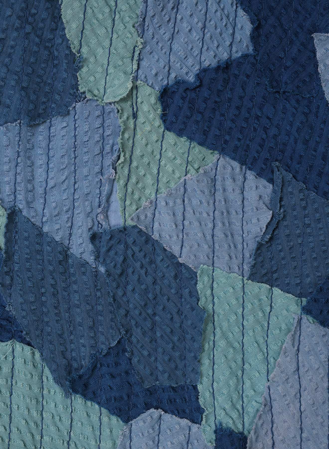 This piece is made from deadstock cotton seersucker, dyed in four colours and hand-cut into panels. Each piece is then meticulously stitched onto lightweight 100s voile, leaving raw edges exposed—a deliberate, time-intensive process that embraces imperfection and celebrates craft.