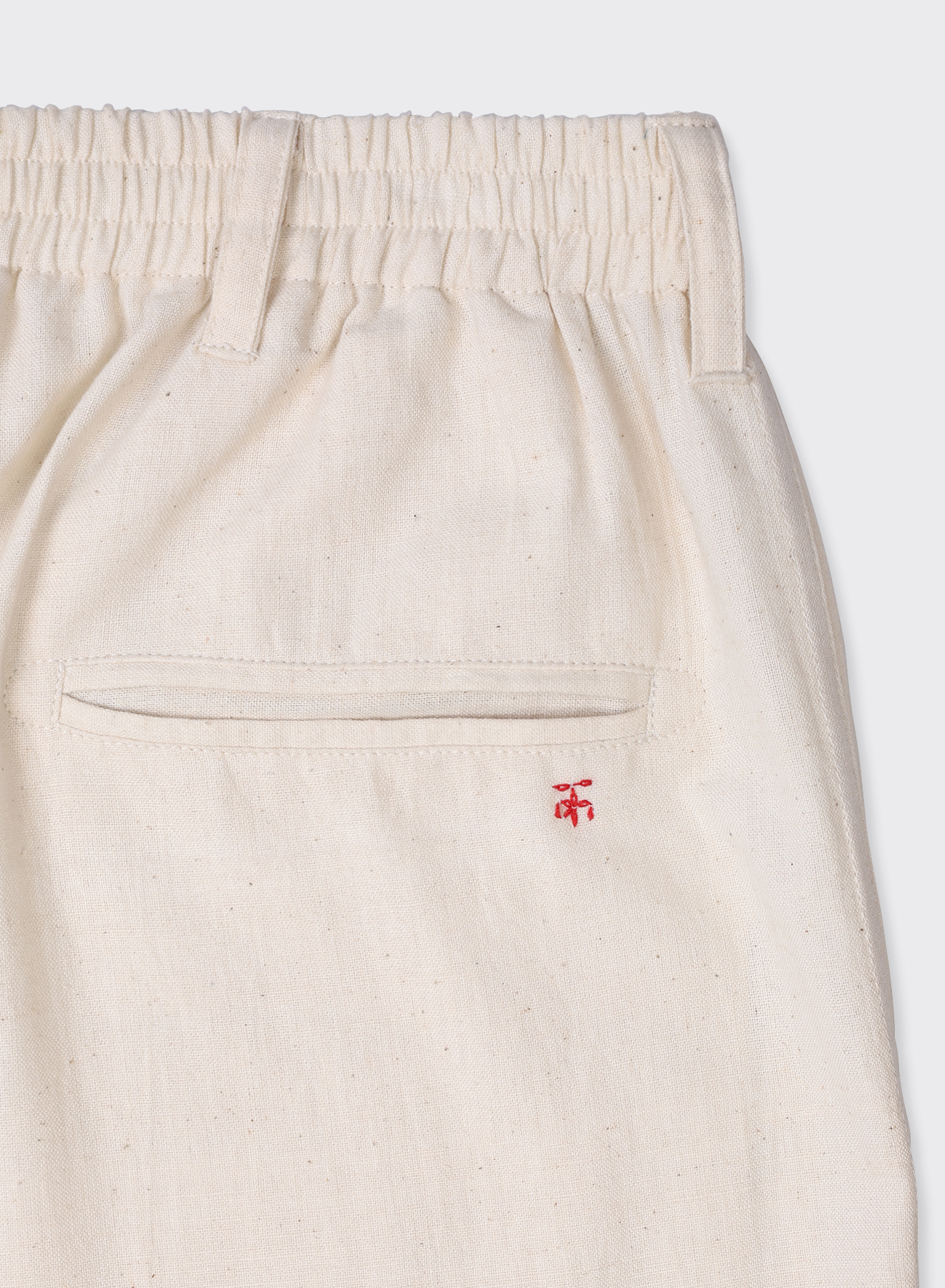 KEDAR is shaped by a relaxed hold at the waist, where the elastic gathers the cloth into an even fall. The leg drops straight from the top, keeping the width consistent without narrowing or flaring. A quiet seam line runs down the front, keeping the overall form easy and unforced.