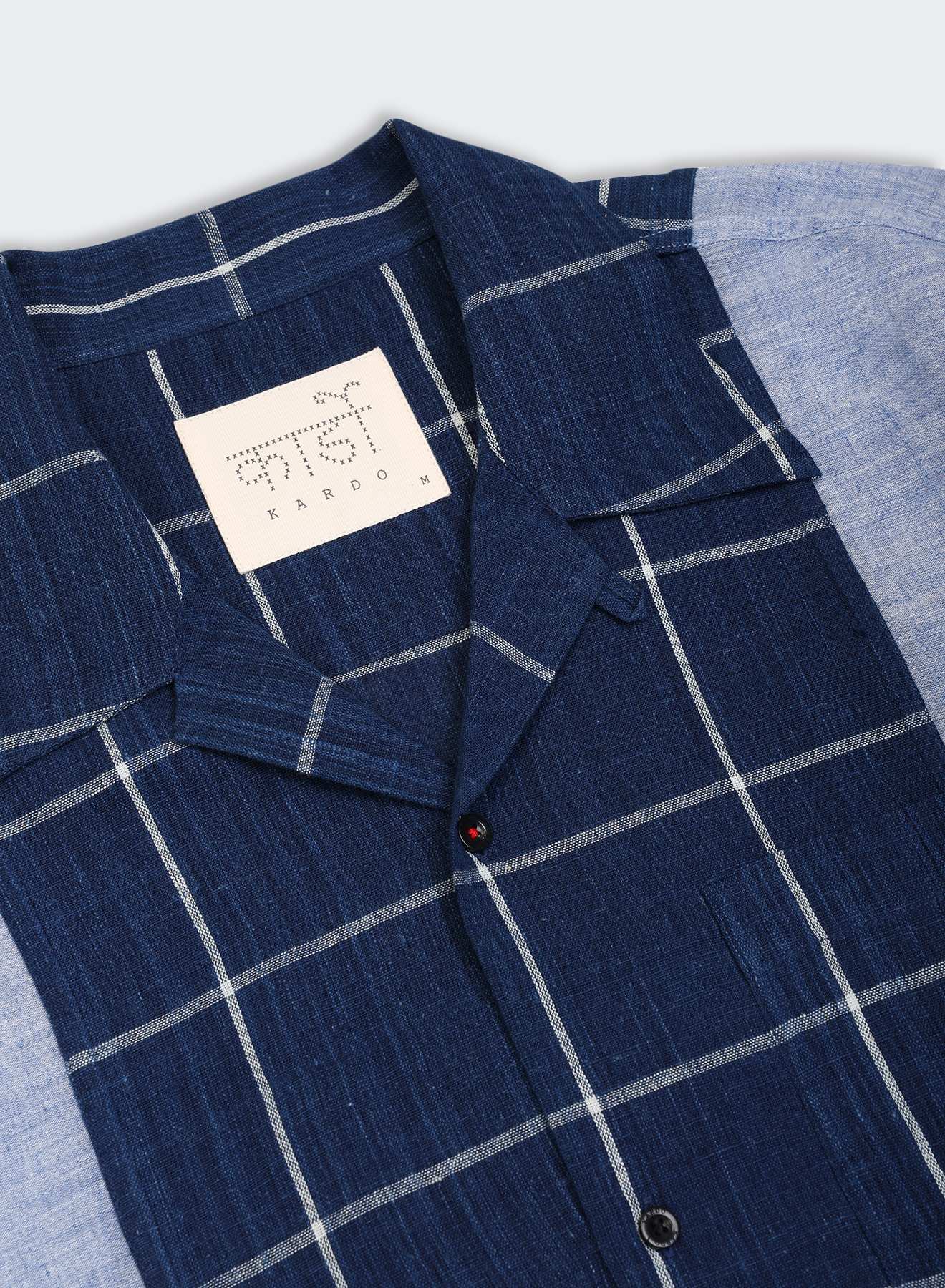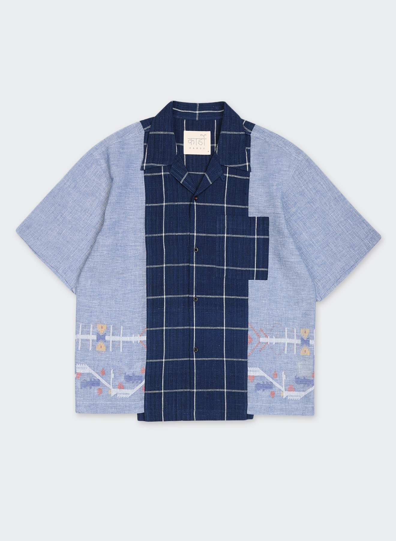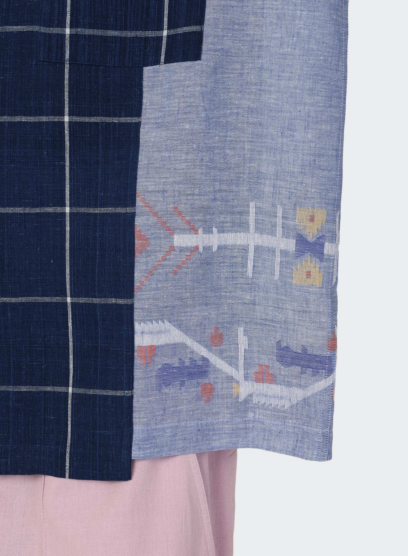 Handwoven Jamdani carries small motifs placed into the cloth as it is made, creating a surface that feels light and open to the touch. Crafted by master weaver Jaggnath Dey in West Bengal, each motif is laid in by hand, one at a time. Indigo-dyed, handwoven check panels move through the form in quiet contrast, offering a grounded counterpoint to the fineness of the cloth.