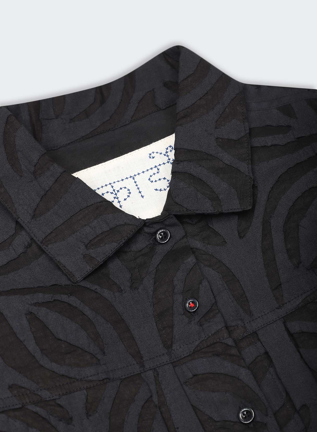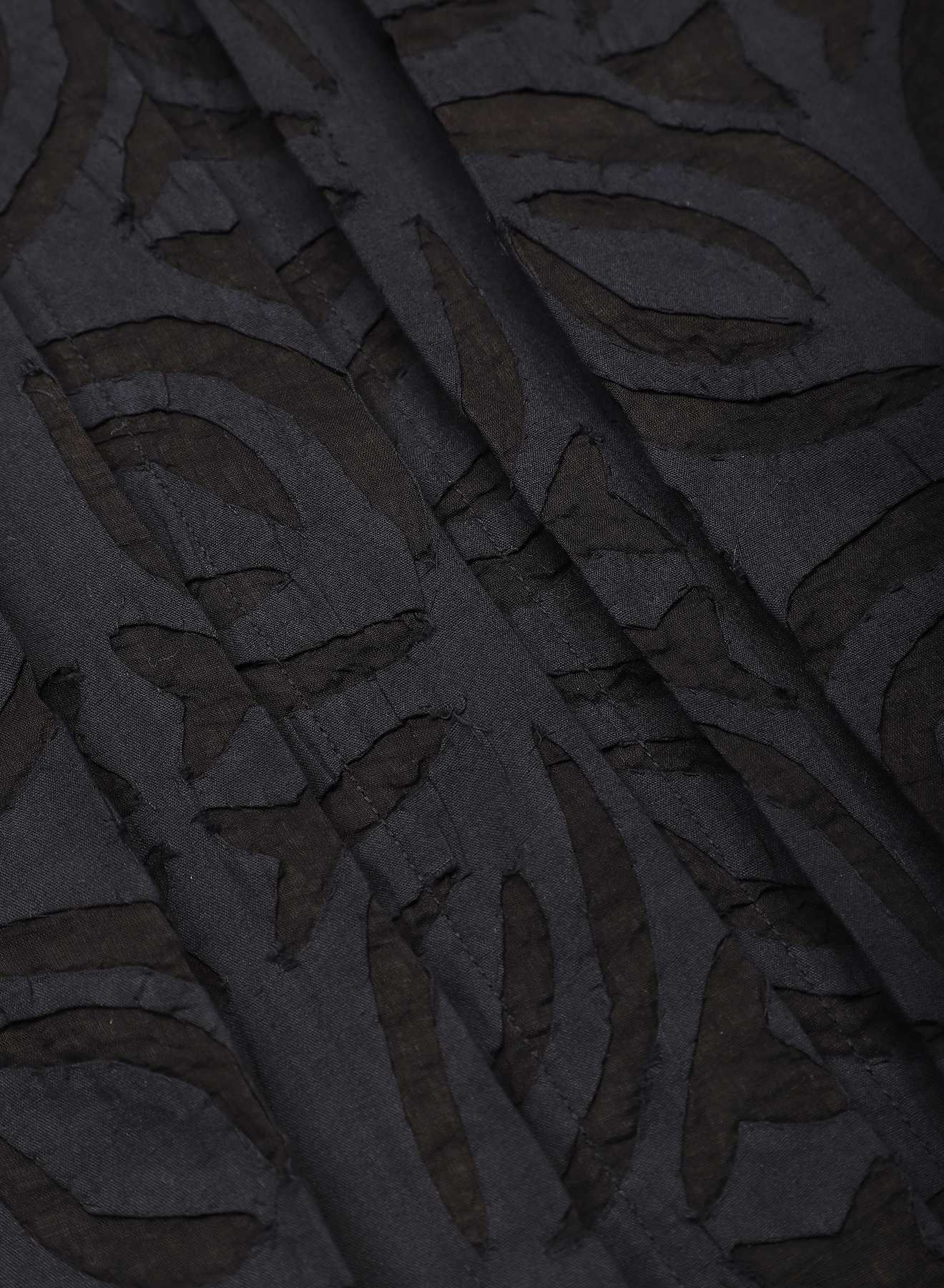 We draw from the Sanjhi tradition of paper-cut stencils, beginning with floral or geometric shapes embroidered into the cloth before their centres are cut away by hand. The fabric is then dyed with plants at Bio Dye, where colour settles around the cut edges to frame each form. What remains is a play between solid and open — a fabric that carries the depth of embroidery and the lightness of sheer, shifting as light moves through it.