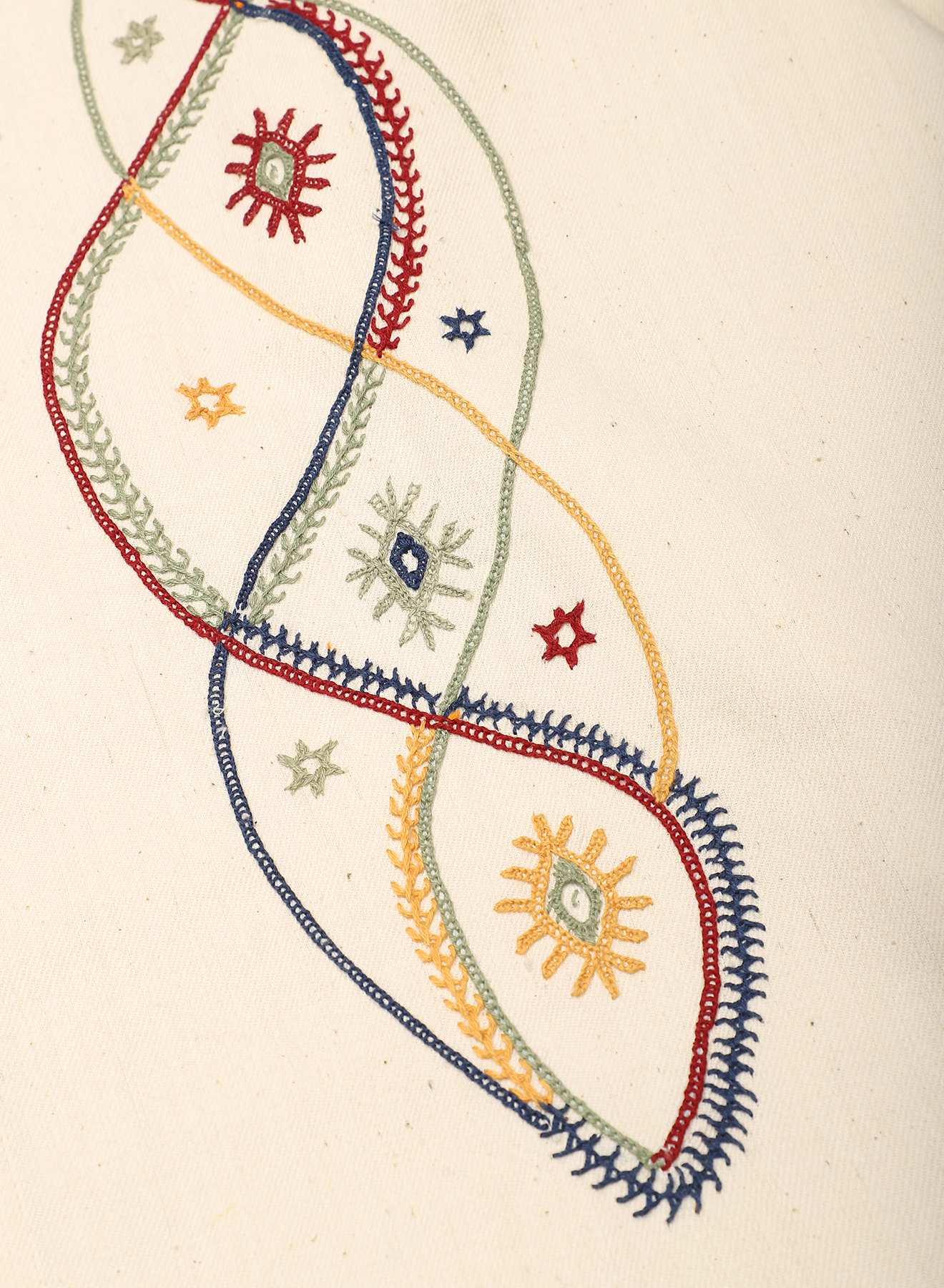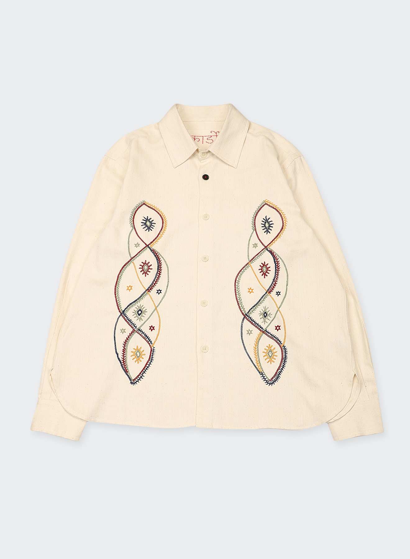 We work with artisans from the Rabari community of Gujarat, where embroidery has long been part of everyday life and dress. Using running, satin, and chain stitches, they build bold motifs in vivid colours, often setting mirrors or shells into the cloth. Each piece is intricate in detail yet confident in character, carrying forward the identity of a tradition that has lived through generations. For us, it is both embellishment and narrative — a surface alive with the history and imagination of the Rabari people.