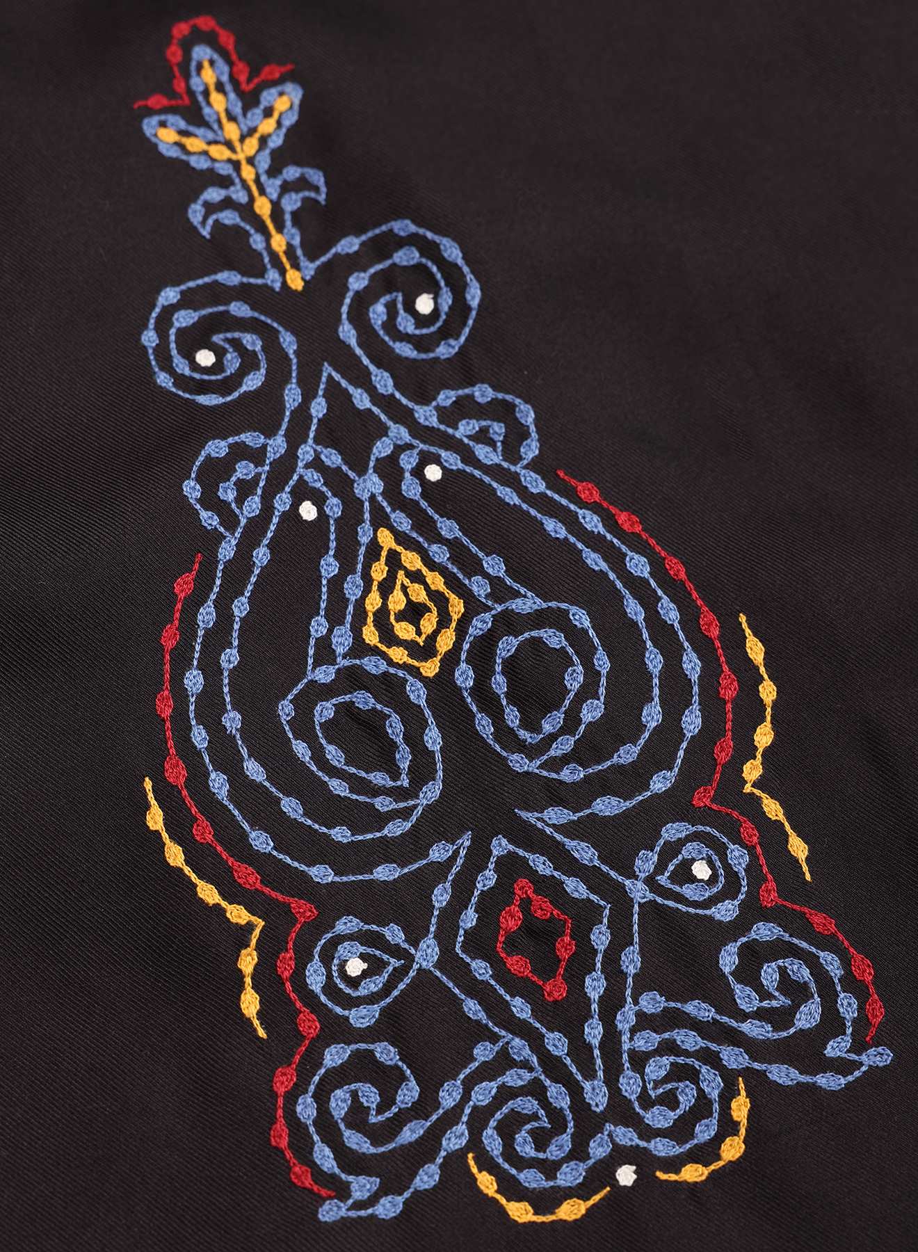 Woven in 100% silk, this fabric carries a soft sheen and a fluid, elegant weight — made more intricate by the Ari technique, a form of chain stitch embroidery practiced for generations in West Bengal. Each panel — guided by Md. Ashraf — a master embroiderer from Kolkata, is hand embroidered before the garment is constructed, to create flowing rhythms of his fine signature across the frame.