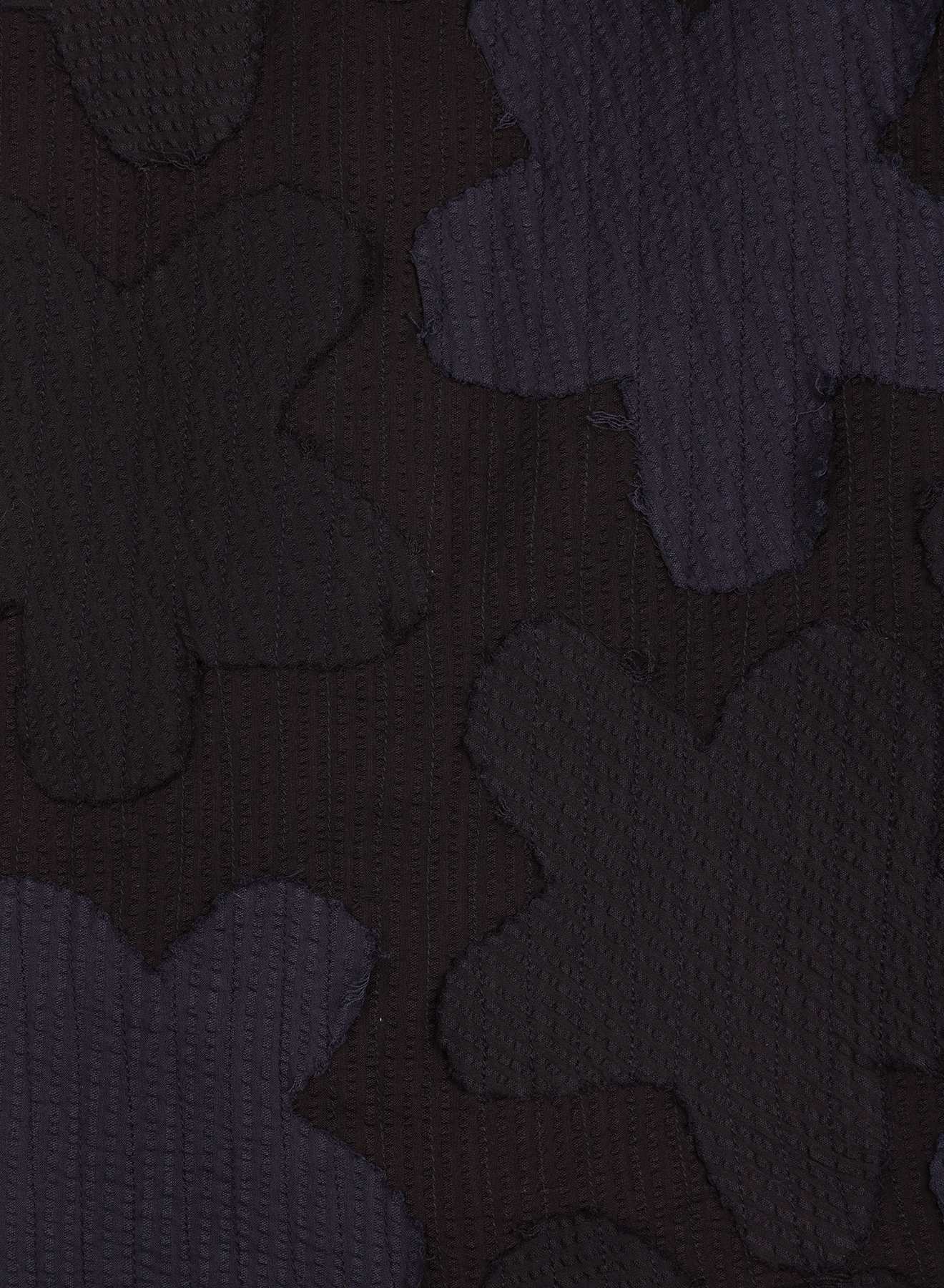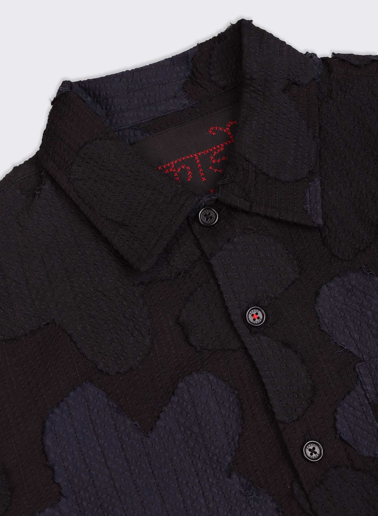 We cut dead stock cotton seersucker, dyed into floral shapes that are quilted together in a camouflage arrangement. The raw edges are left visible, softening the outlines as the fabric is used and handled. What results is a surface layered with colour, pattern, and texture — one that shifts with wear, changing slowly in both look and feel over time.