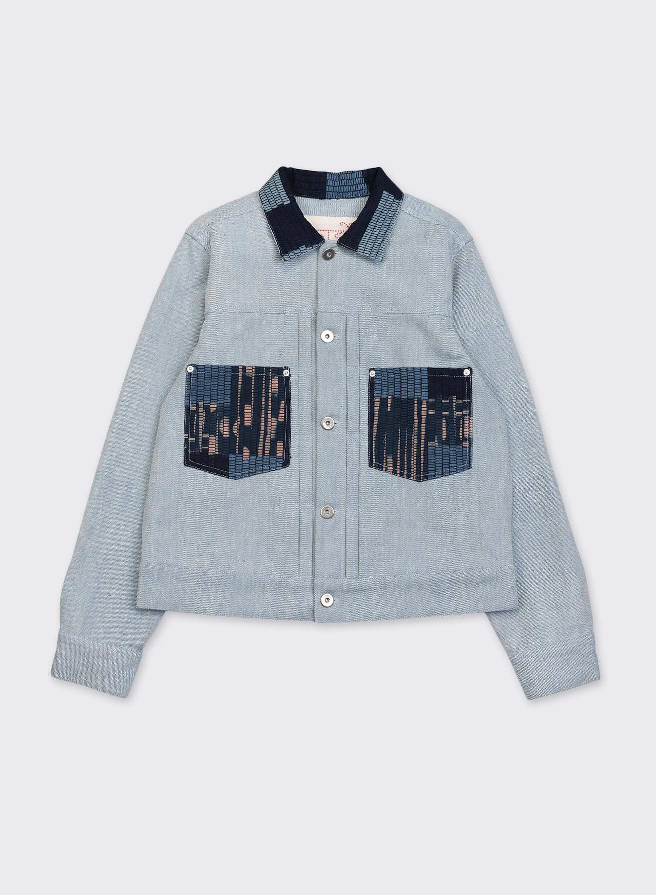 Collar and pocket details feature patches made from upcycled textile waste from our previous collections. Ashita Singhals Paiwand Studio transformed these scraps into a striking pattern, weaving stripsbonded with natural glue into a braided structure on a handloom.