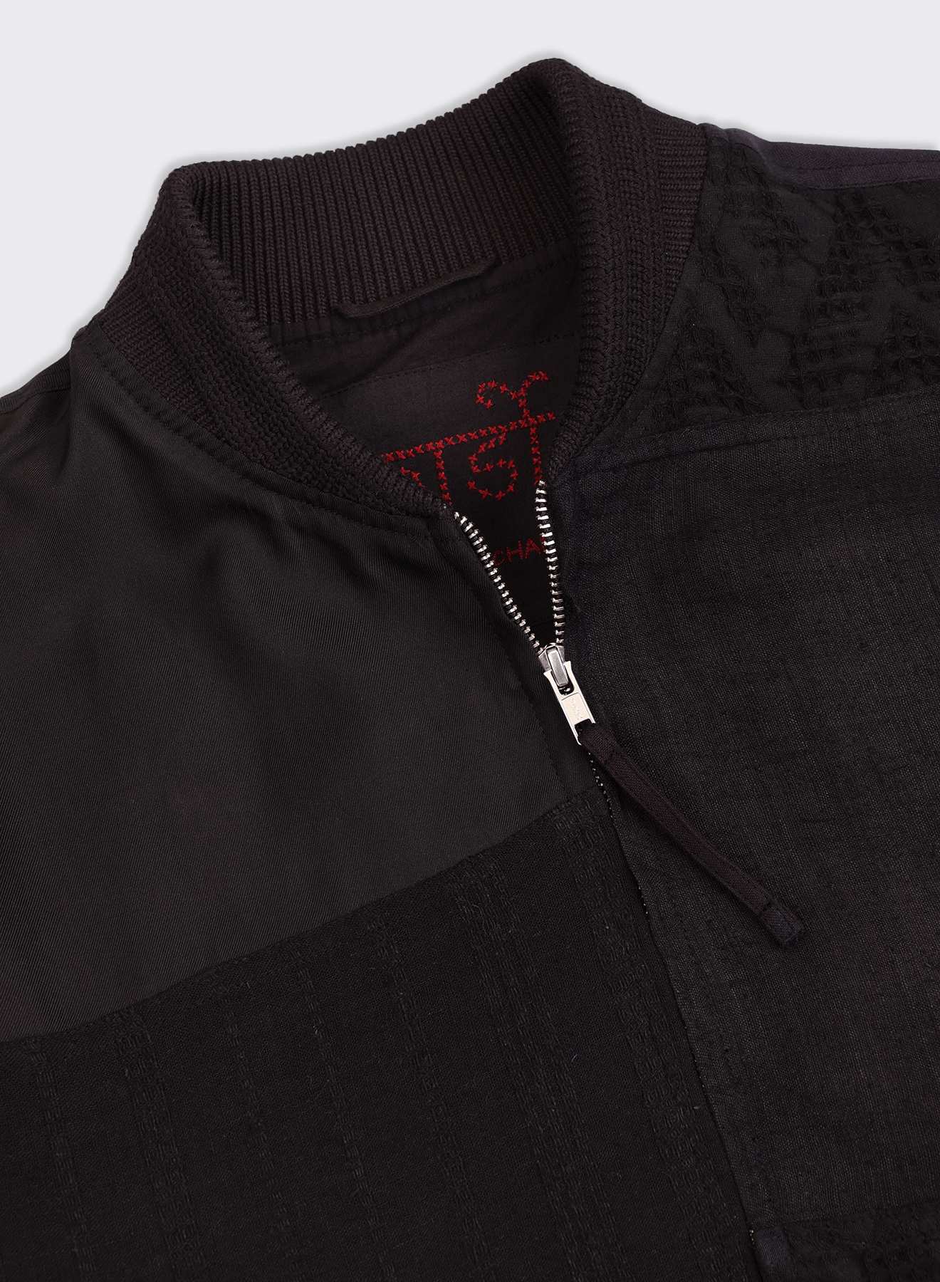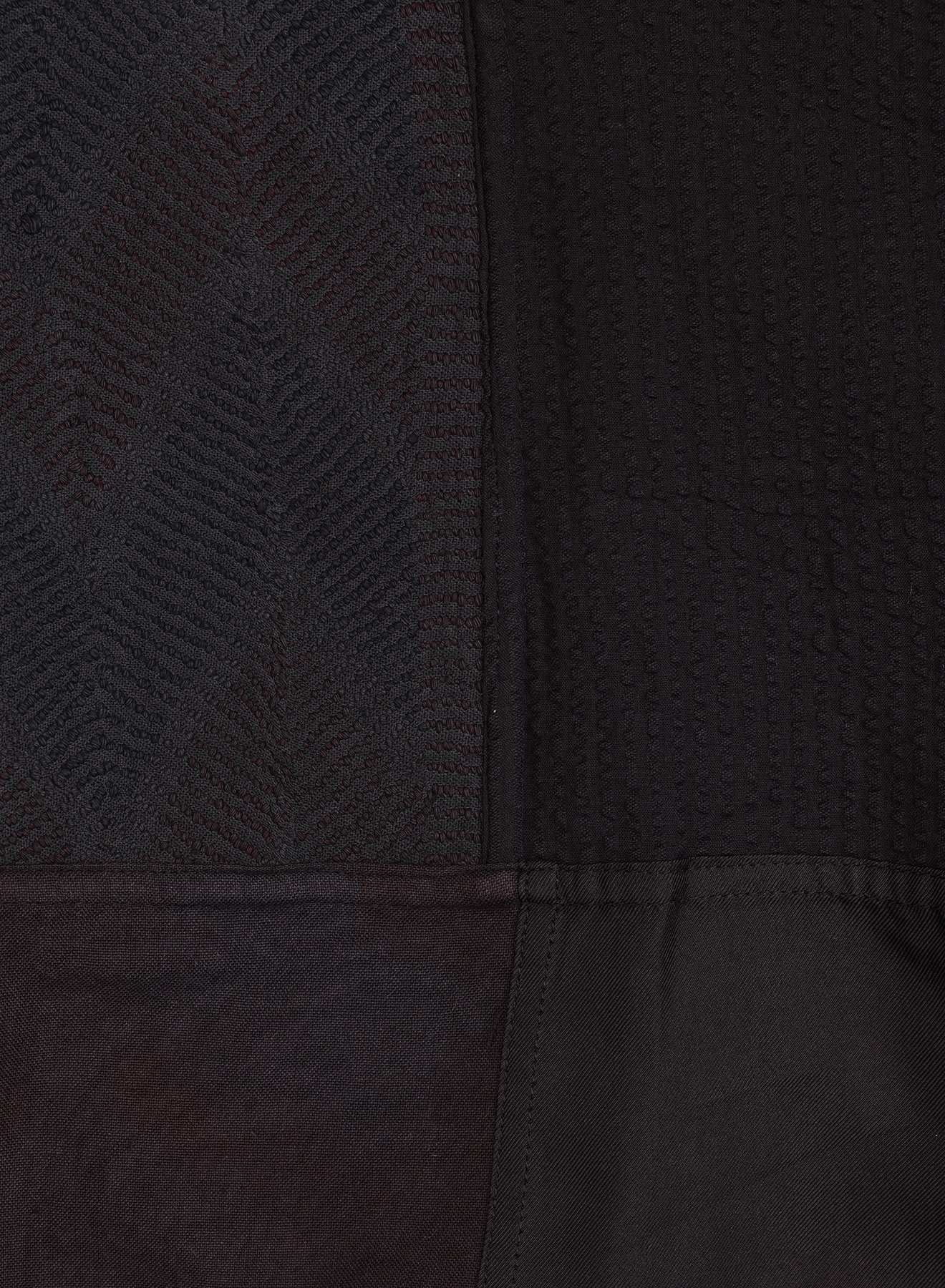 Every panel in this fabric represents a traditional Indian textile craft, then slowly overdyed to deepen it into a spectrum of black, for depth and variation. We cut these pieces with intention—each selected for its shade, grain, and bearing—and join them in patchwork. As the seams come together, the different textiles form a landscape of blacks, carrying the quiet richness of each craft across the surface.