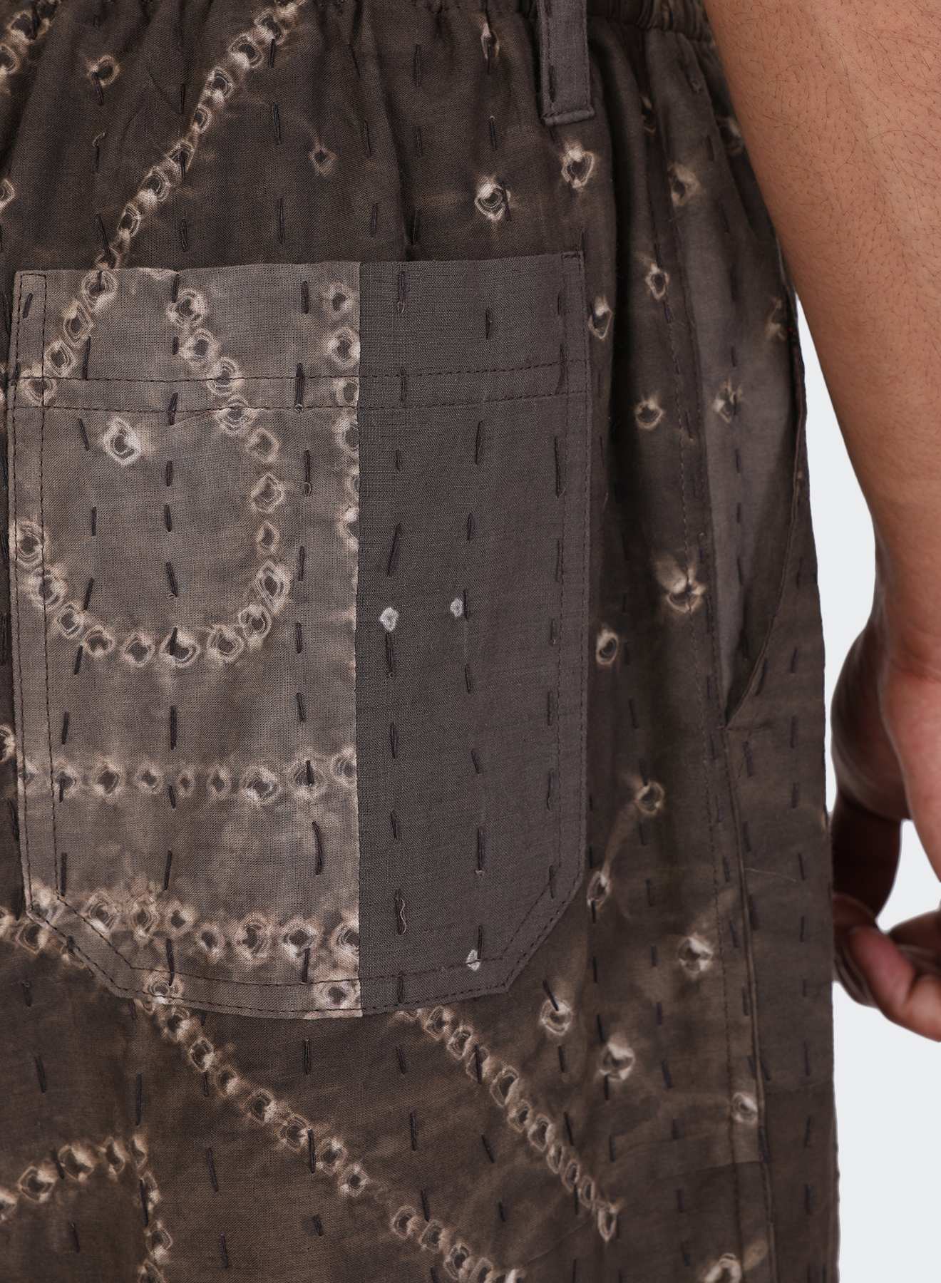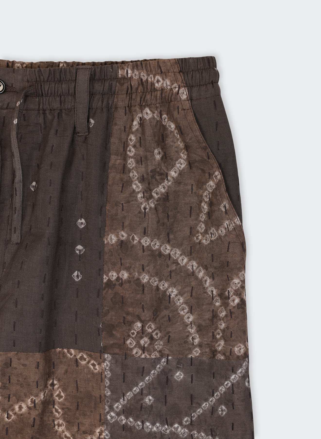 Bandhani, derived from the Sanskrit word ‘Banda’ meaning ‘to tie,’ is a skilled dyeing technique where fabric is tightly hand-tied at multiple points to create intricate patterns. This slow process uses only natural dyes.These patchwork pieces are crafted by fabric created by Suraj Narayan Titanwala and his family in Bagru, Rajasthan, renowned natural dye artisans who can trace their artistic lineage over 500 years. In addition, these pieces feature hand-embroidered kantha stitch detailing.