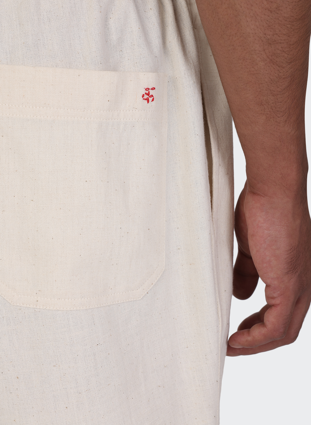 We work with hand-spun and handwoven khadi, made for us by Udyog Bharti. Its surface holds small shifts in tension and tone, with slubs and gentle irregularities that arise from the hand process — details that make every piece unique.