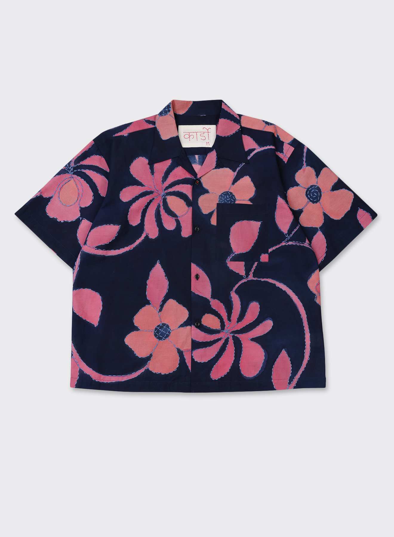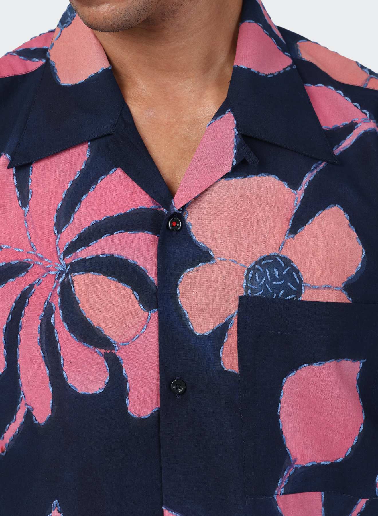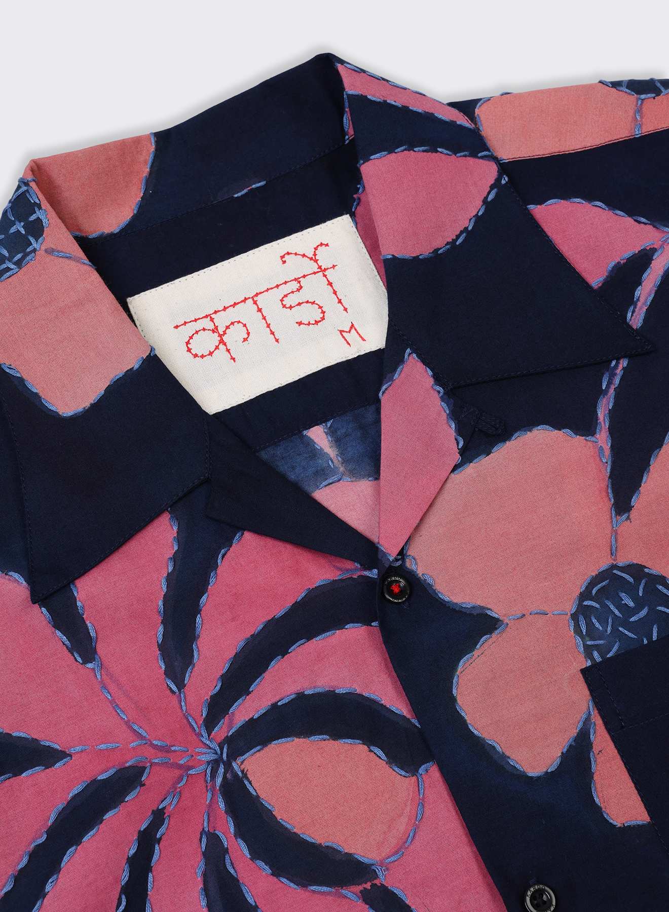 This fabric is crafted by Srikanth Mishra, a generational hand block printer from Varanasi. Since 2022, he has been exploring the art of hand-painting on textiles. Here he creates delicate floral patterns with pigment colors on lightweight cotton. The piece is finished with intricate kantha hand-stitch detailing.