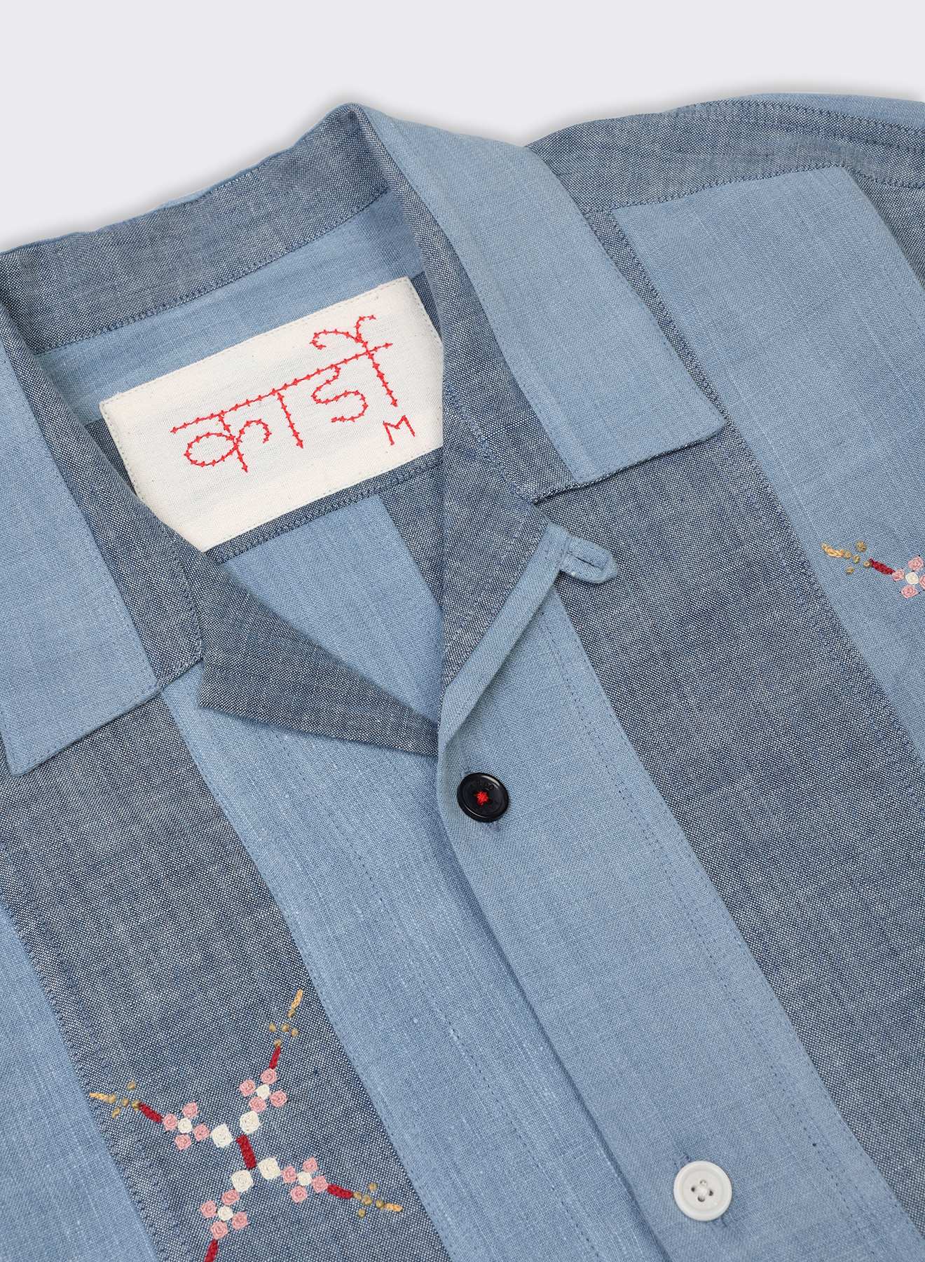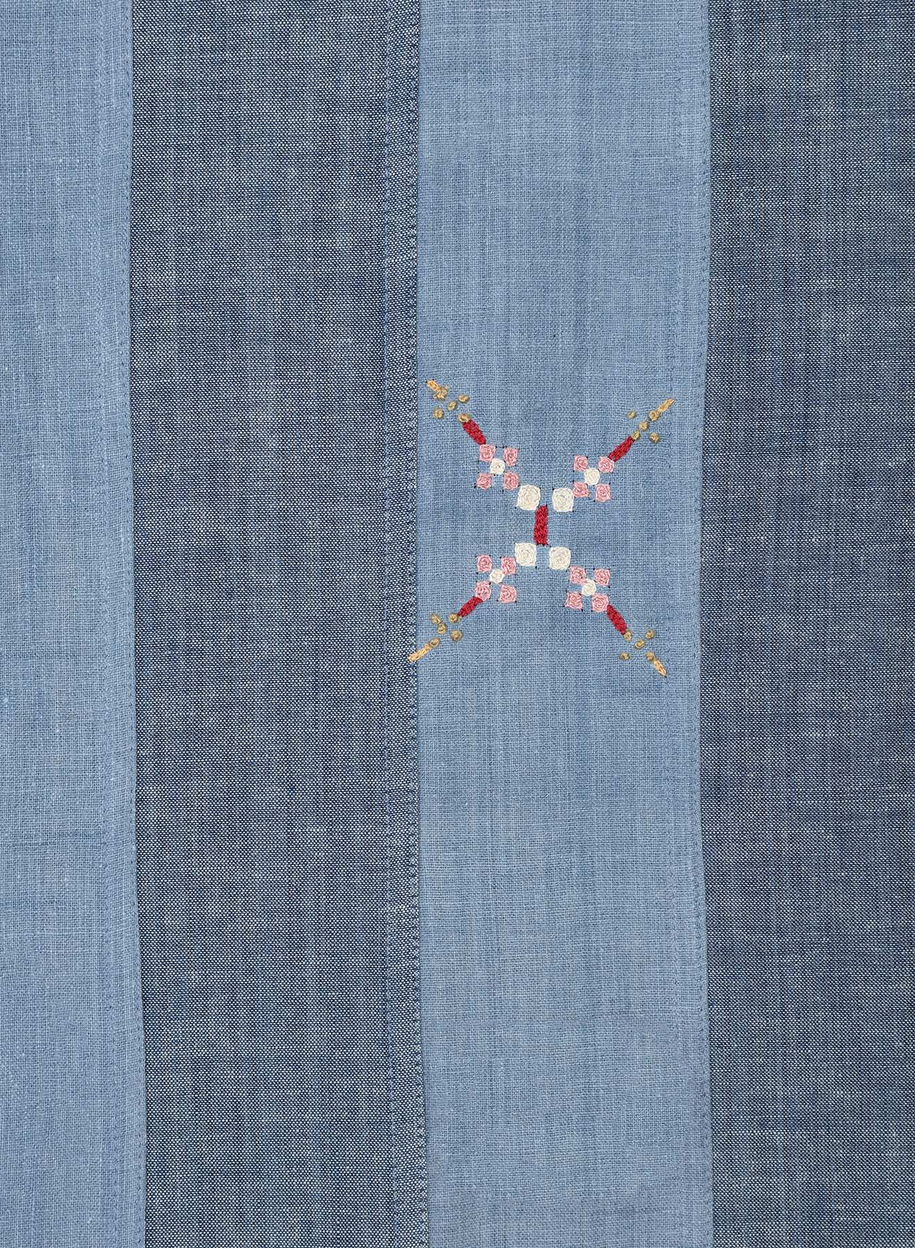 Khadi cotton, hand-spun and handwoven for us by Udyog Bharti, forms the base of this piece. Across this surface, Md. Ashraf — a master artisanfrom Bengal — works with chain stitch and French knots, setting geometric floral motifs inspired by the Nakashi patterns found on courtyard walls in village homes. Each panel is embroidered patiently by hand before it is stitched, allowing the fabric’s quiet texture to sit alongside the fine, deliberate marks of Ashraf’s work.