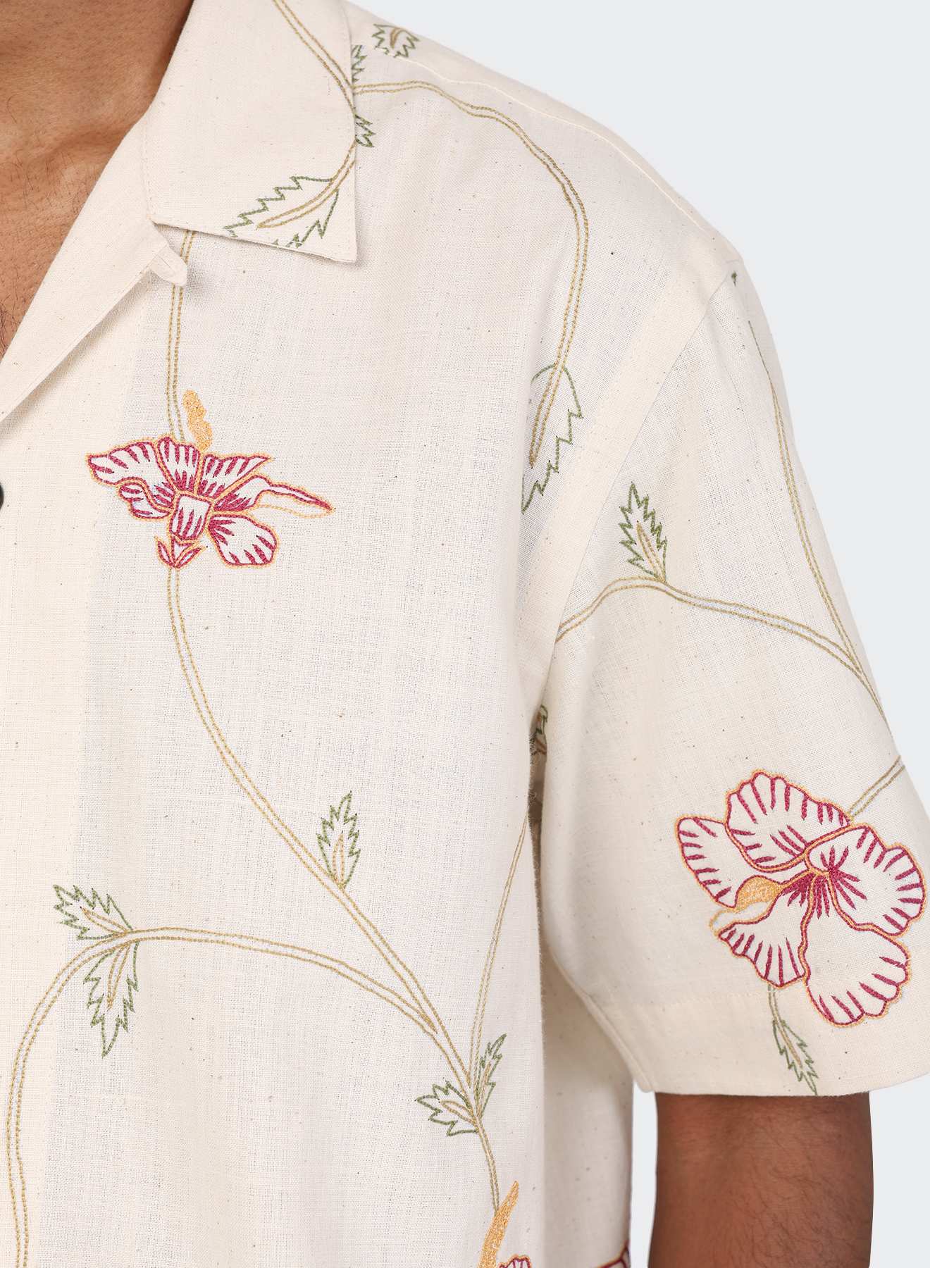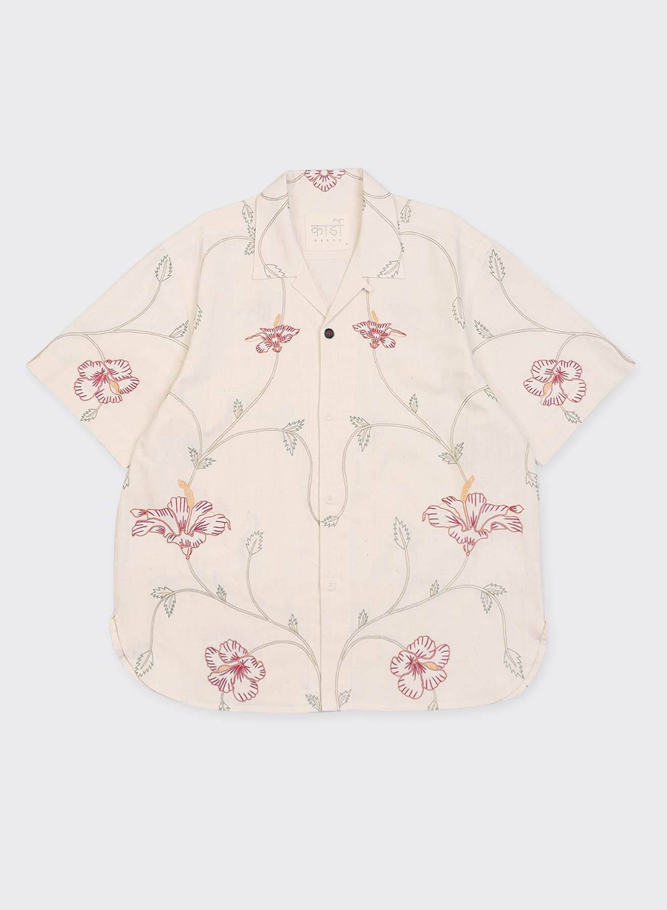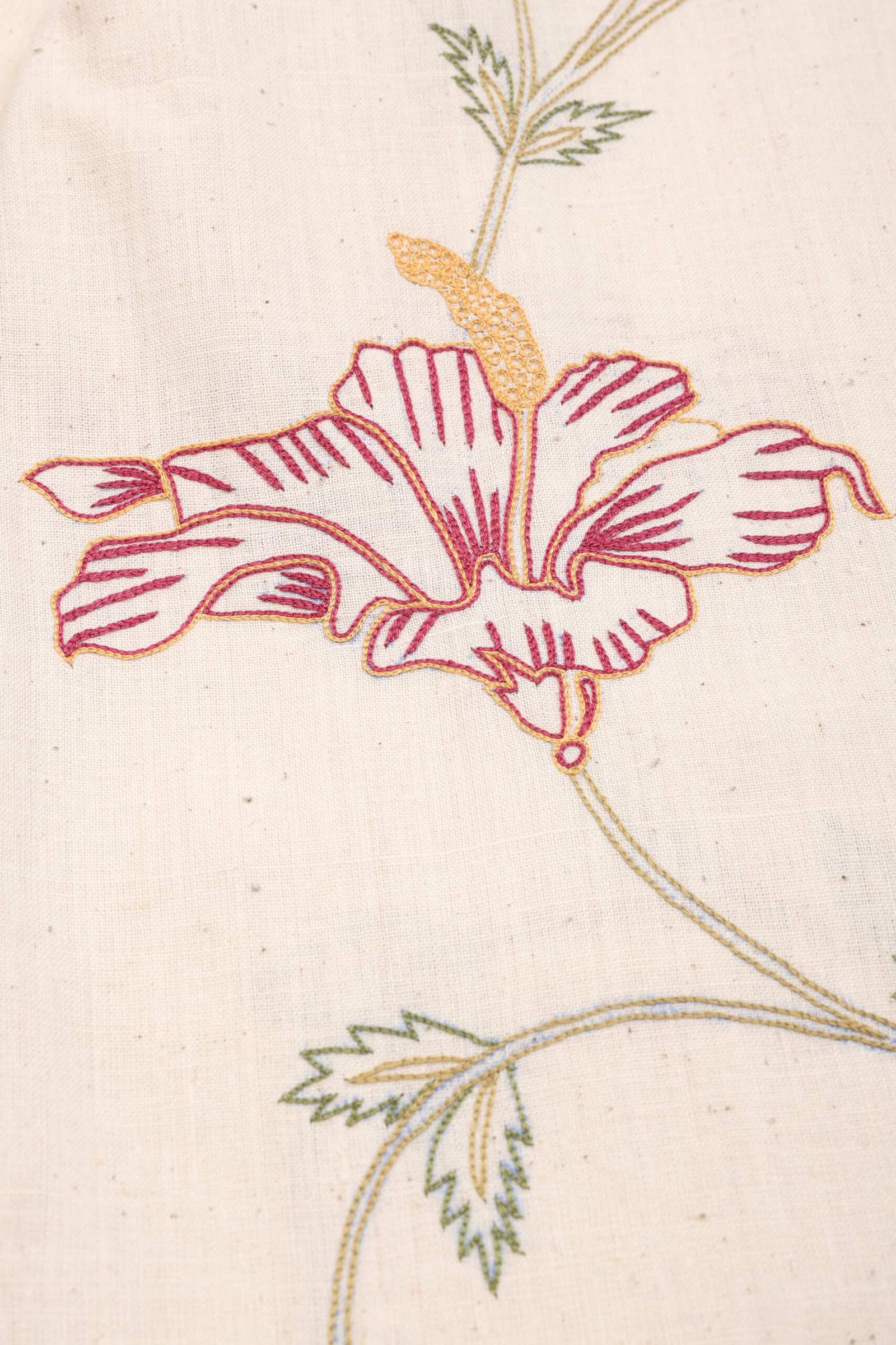 Khadi, a hand-spun and handwoven organic cotton fabric, is woven for us by Udyog Bharti. On this undyed, and unbleached base, Md. Ashraf — a master embroiderer from Bengal — works with ari chain stitch to create flowing rhythms across the frame. Each panel is embroidered patiently by hand before it is stitched together, so that the garment emerges with khadi’s natural texture, traced with the fine signature of Ashraf’s embroidery.