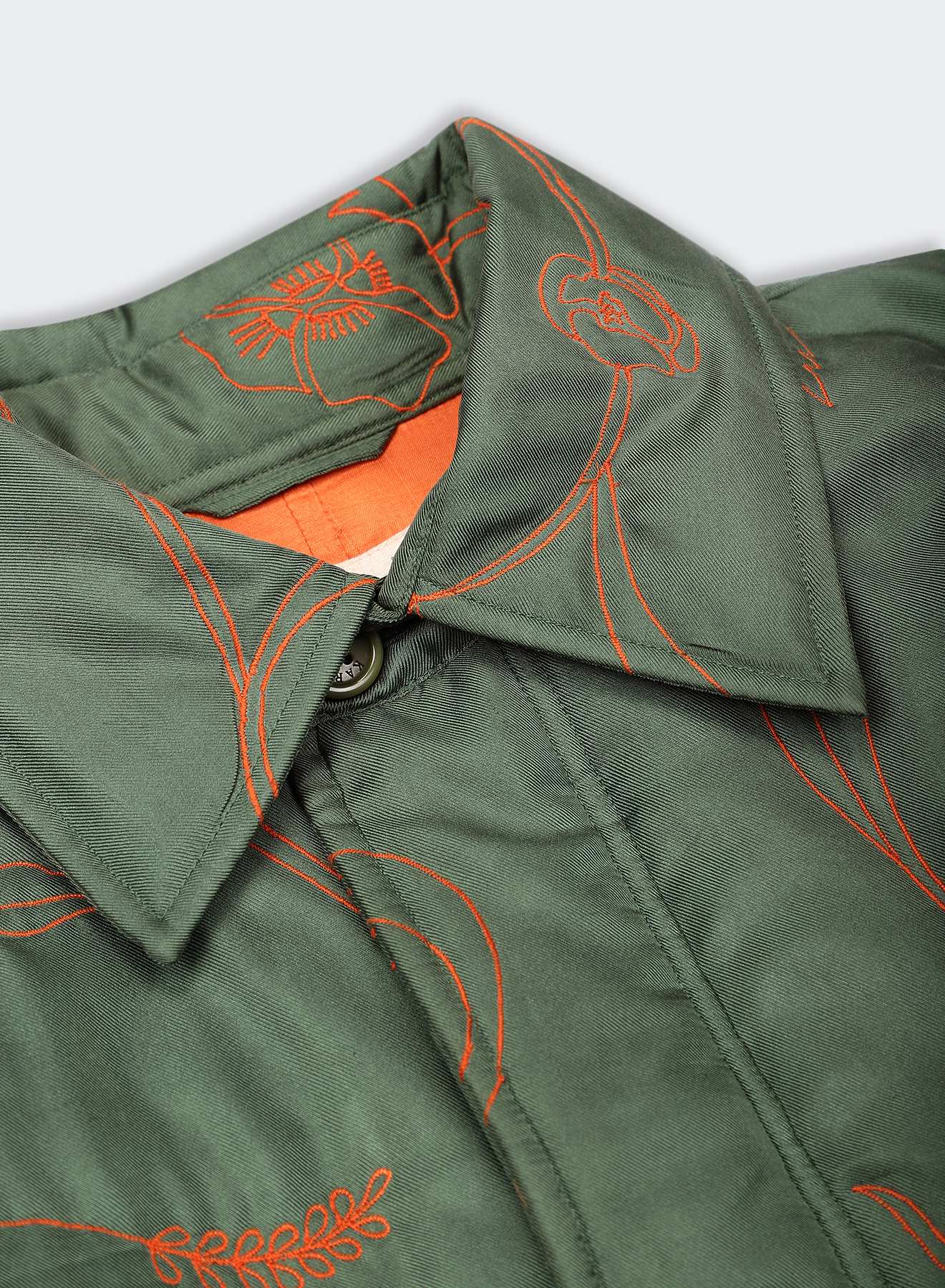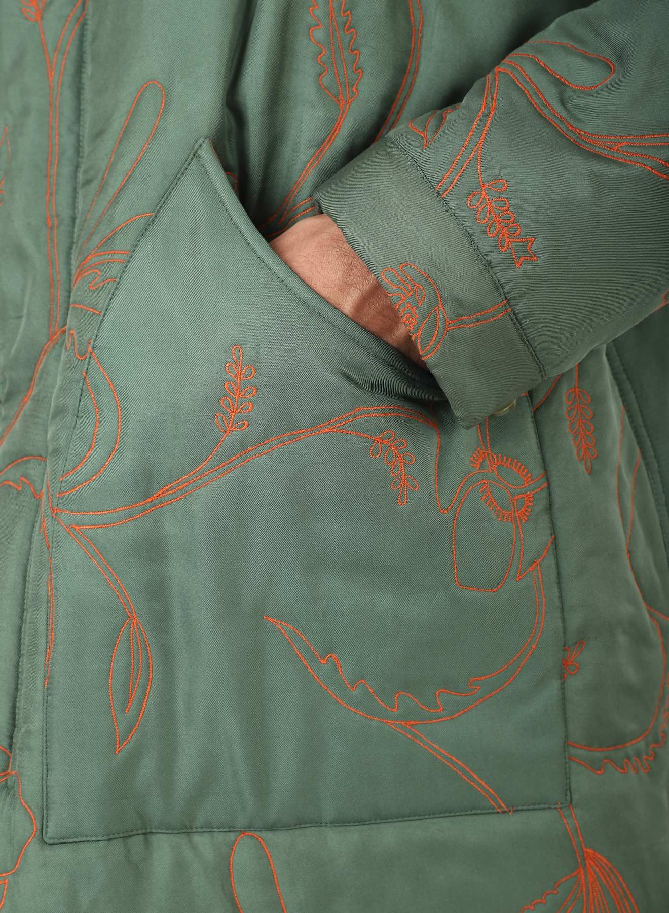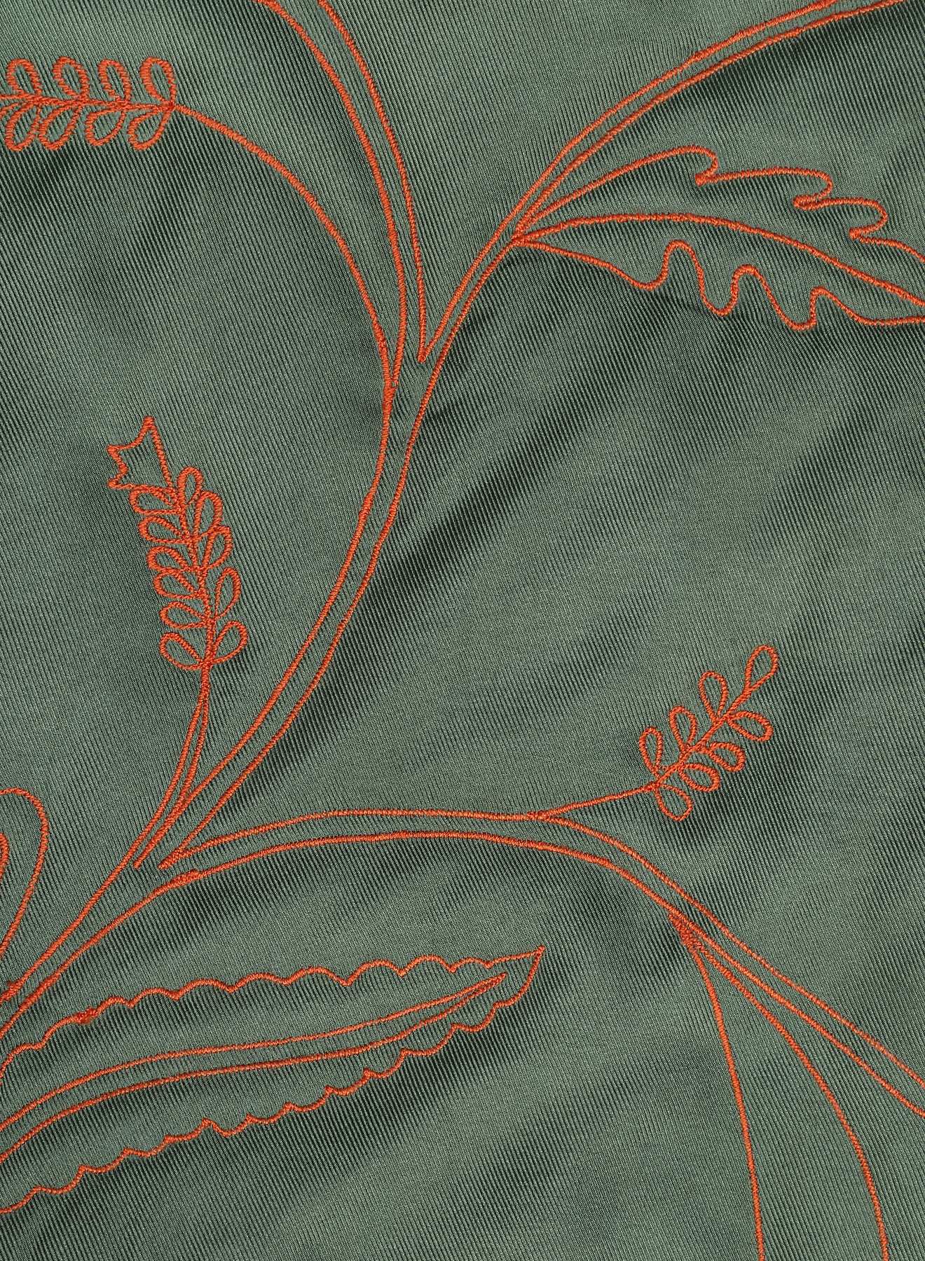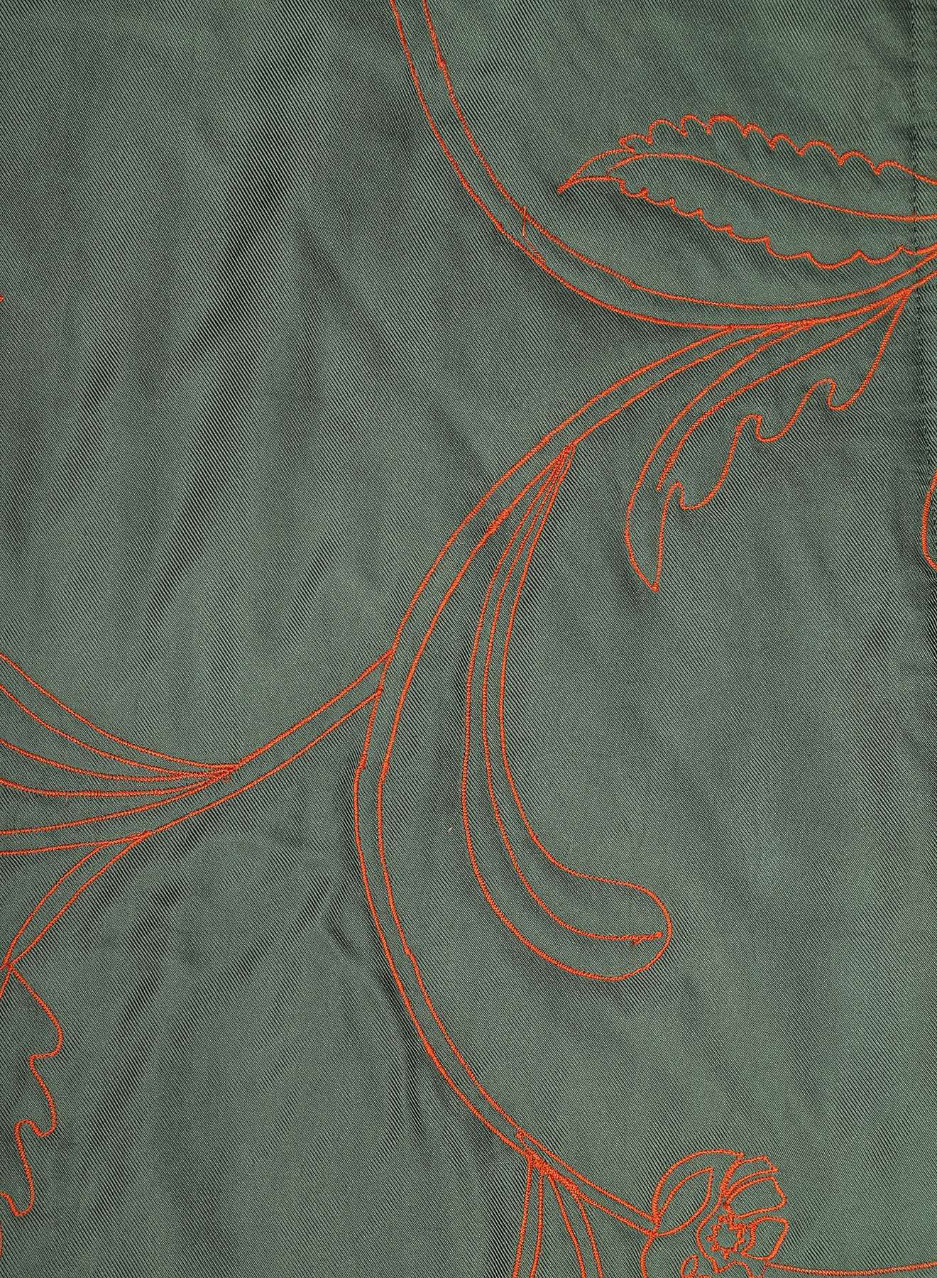 Woven in 100% silk twill, this fabric carries a soft sheen and a fluid, elegant weight—made more intricate by the Ari technique, a form of chain stitch embroidery practiced for generations in West Bengal. Each panel is embroidered on a frame before the garment is constructed, guided by Ashmat Ali, a seasoned artisan from Kolkata, with over two decades of craft behind him. This slow, deliberate process gives the fabric a pulse that carries into the final form of our designs.