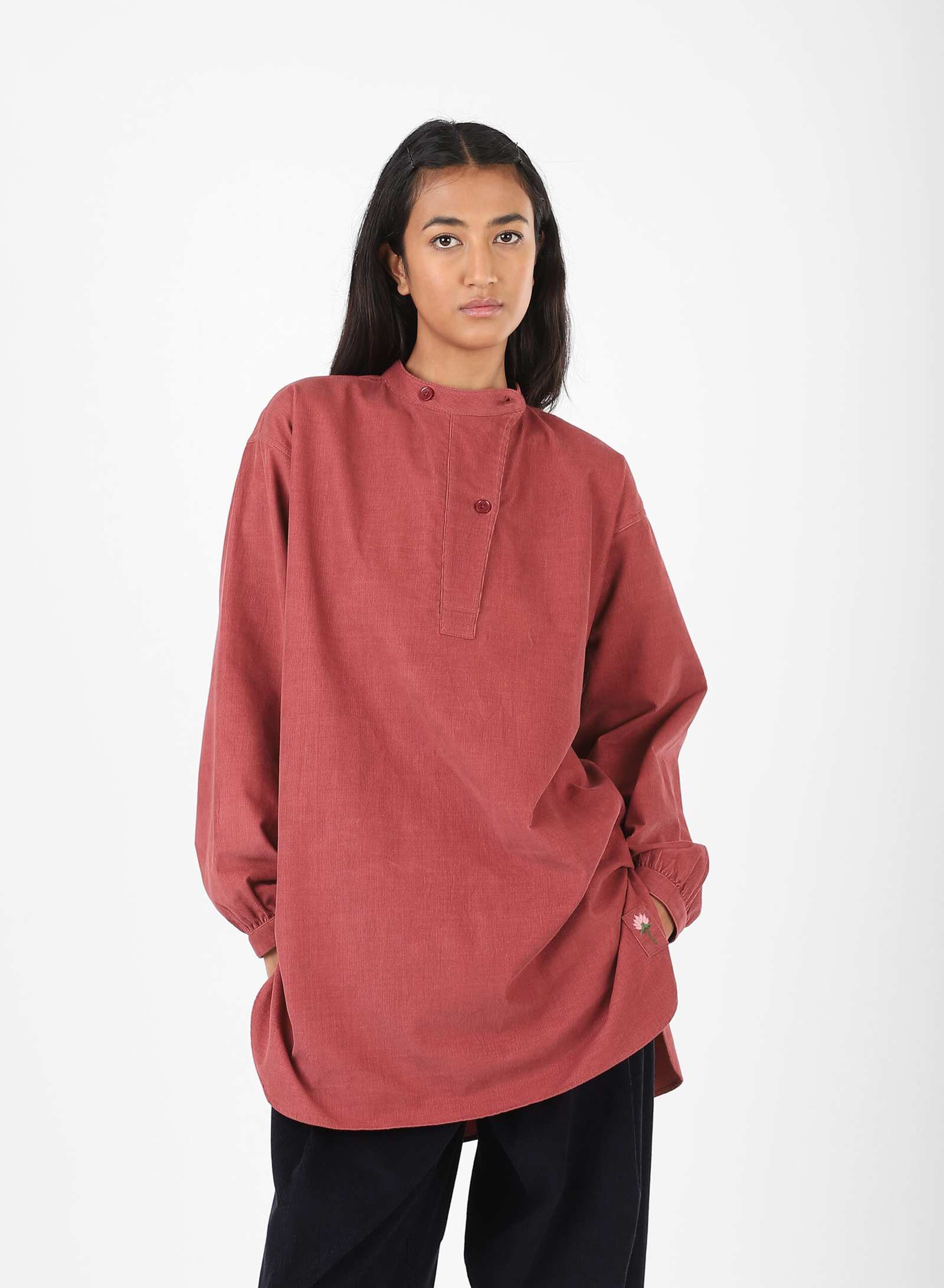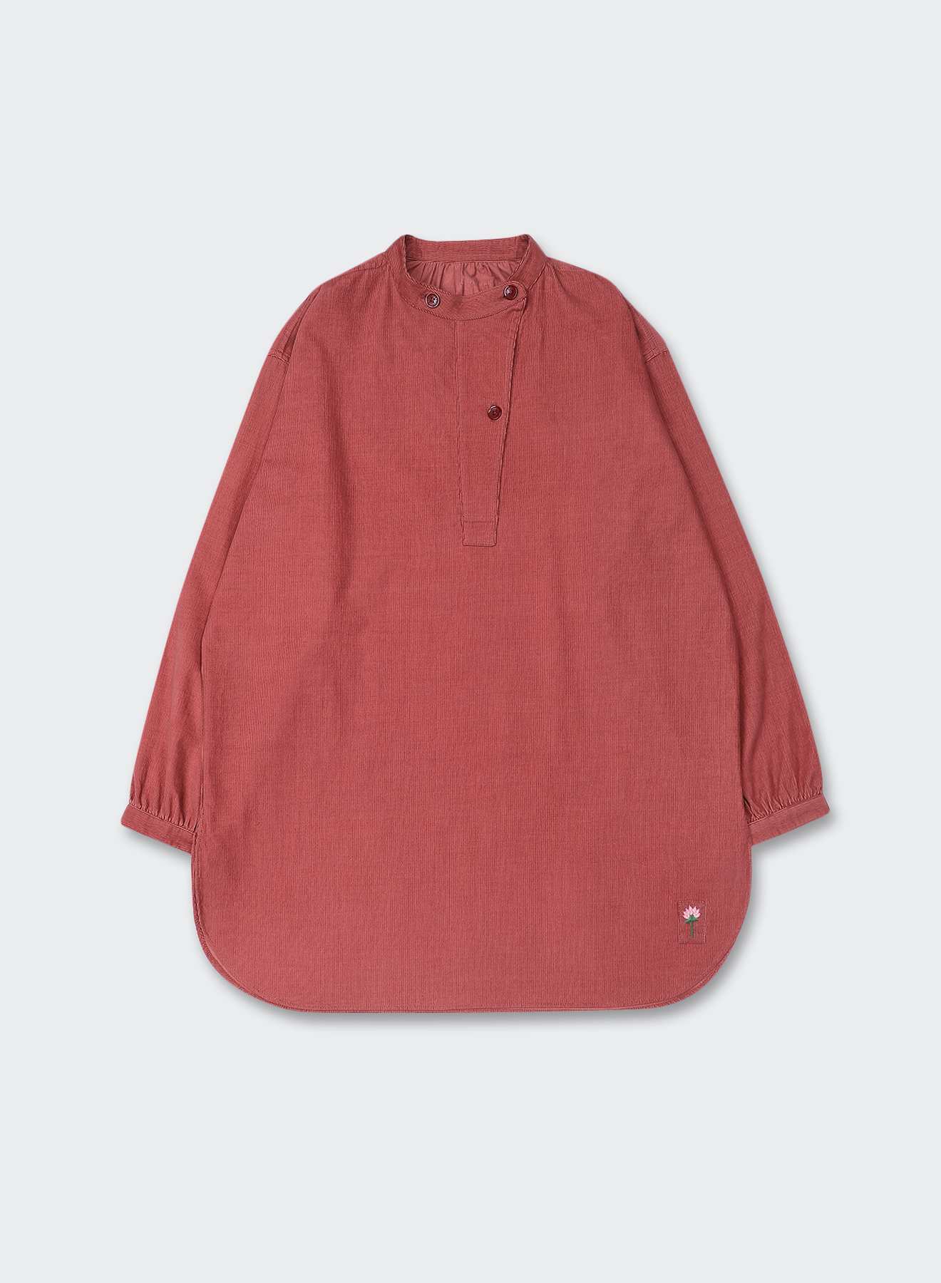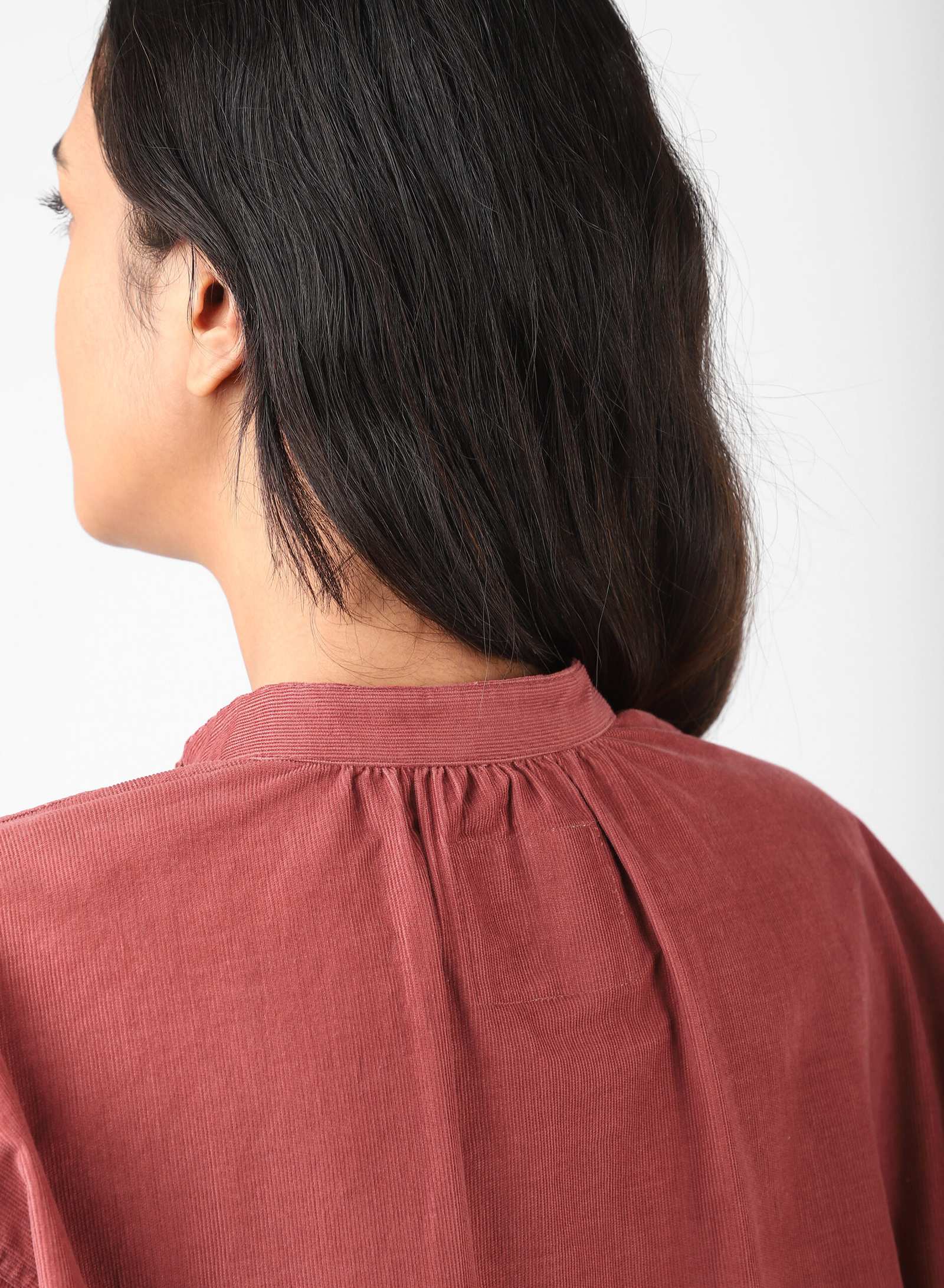 SAROJ takes its cue from the Swedish military shirt, built with an overlapping placket for a compact, ordered front. Gathers behind the collar open into the back panel, giving a measured lift across the shoulders. The shape remains grounded, flowing naturally from neckline to hem.