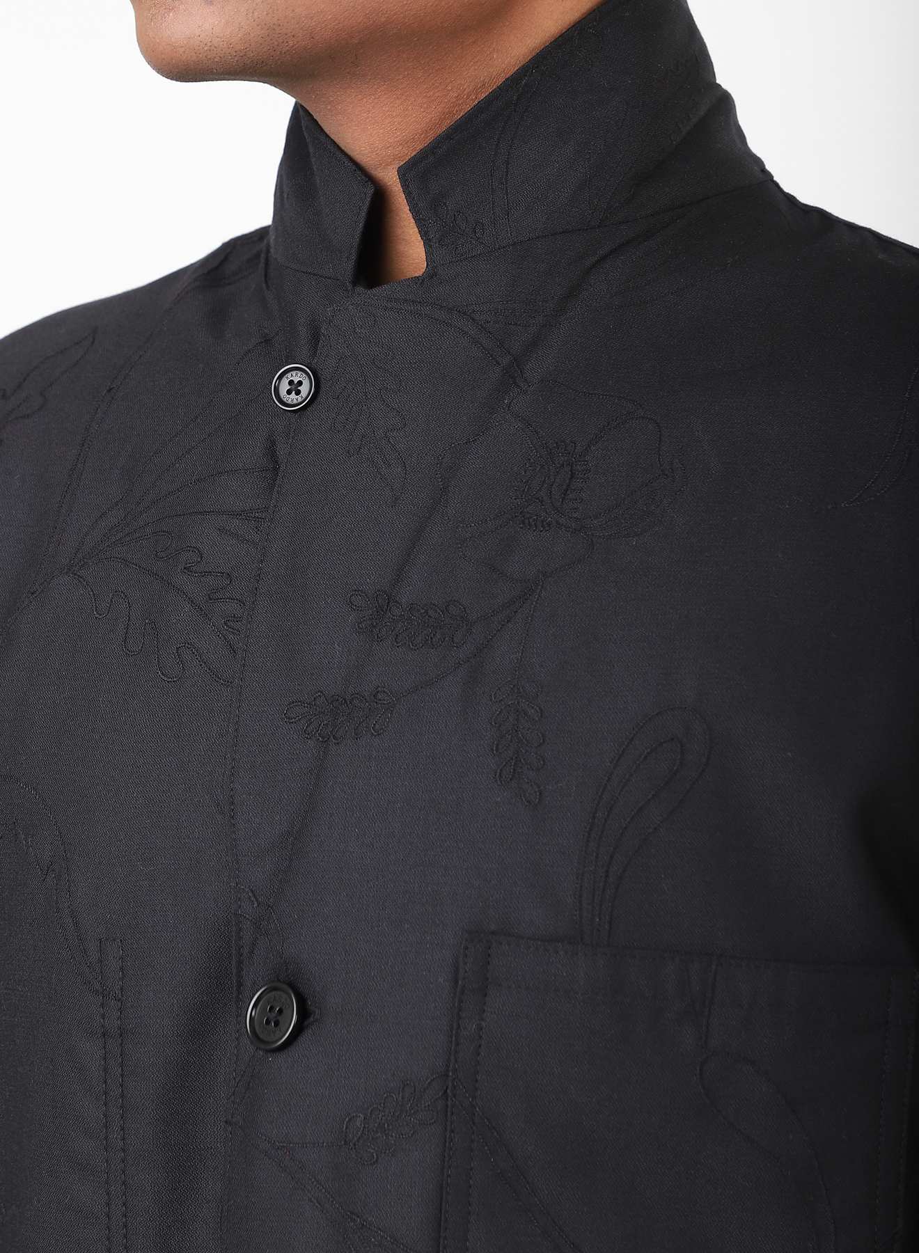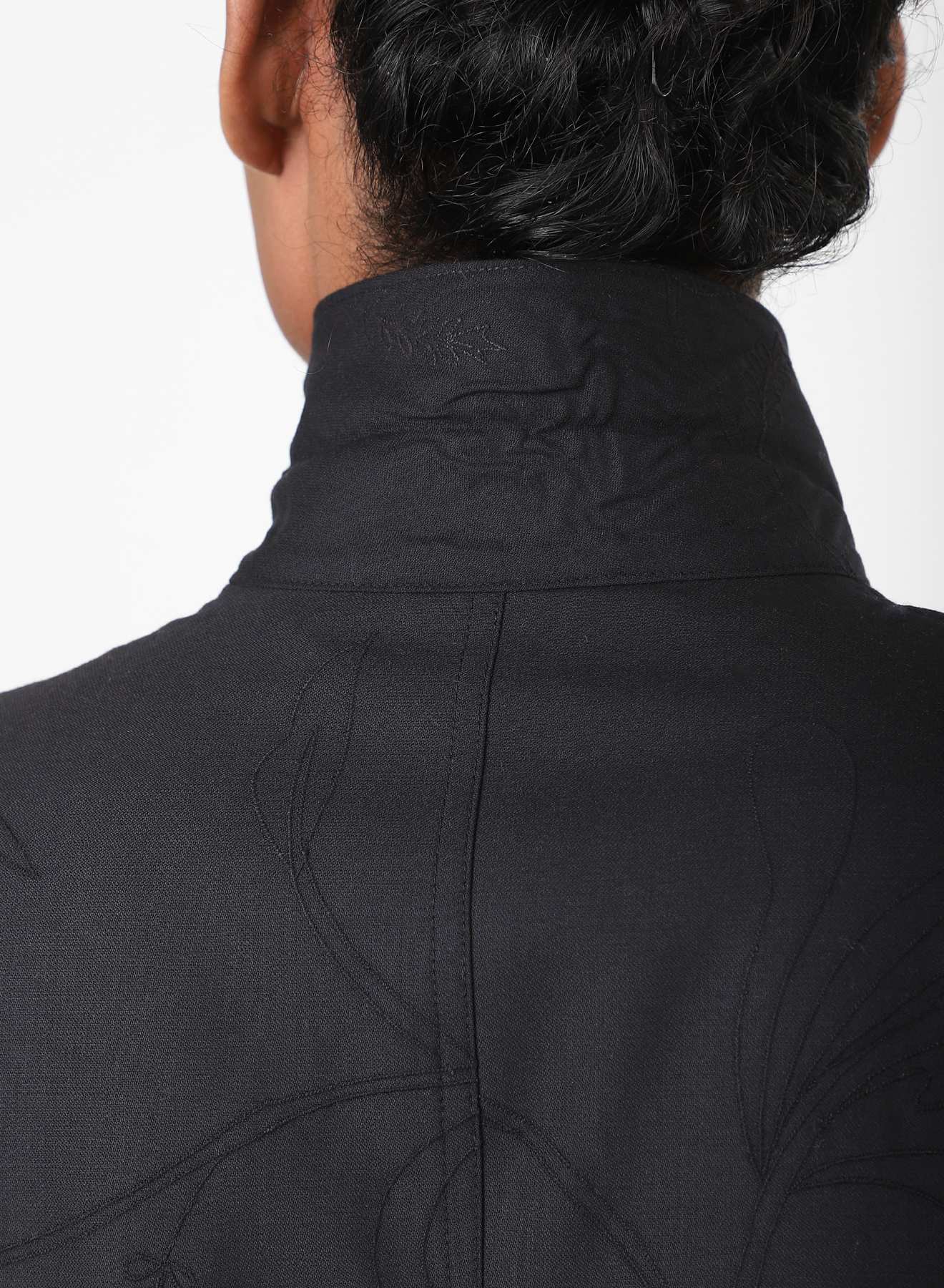 Woven from Super 120s wool at Huddersfield—one of India’s finest suiting mills—this cloth holds its shape with ease and refinement. We’ve known its grain intimately: how it falls, how it holds, how it yields under a thread. Light on the body, the fabric carries a fluid drape that allows ease of movement while holding its line with natural crease resistance. Our relationship with this fabric makes it a natural canvas for embroidery—each motif guided by hand on a sewing machine by seasoned artisan Hasmat Ali, practicing his craft from a space tucked just behind our studio.