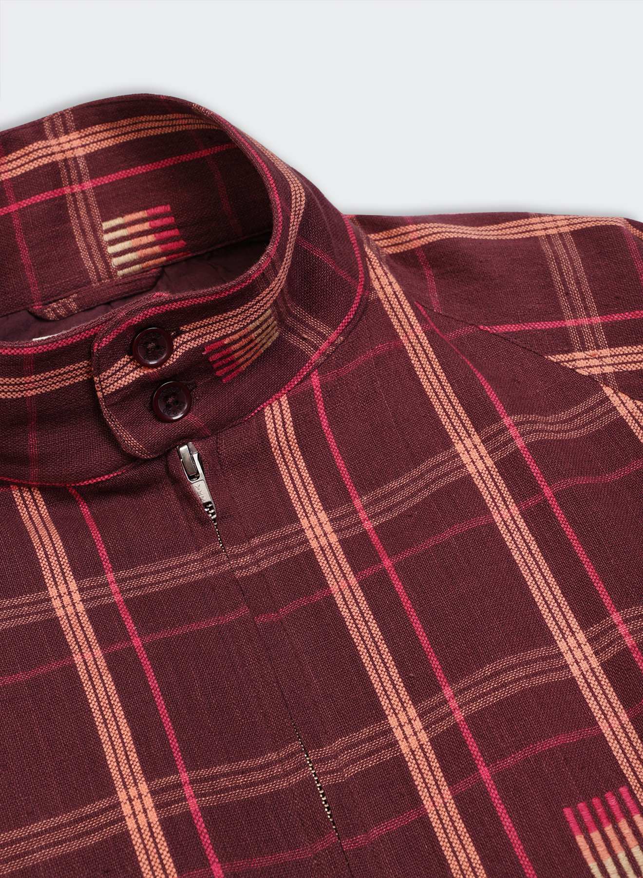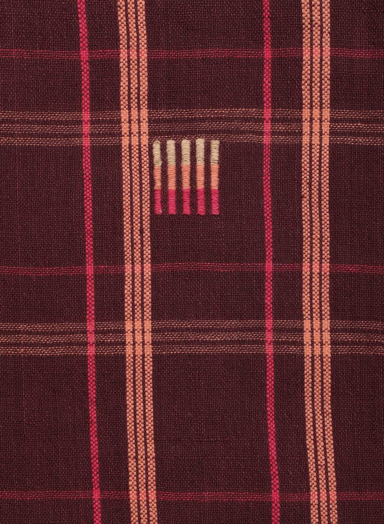 Dyed yarns are handwoven into a check pattern, enhanced with motifs using the extra weft technique—a meticulous, discontinuous weaving method where denser threads are hand-inlaid into the warp.