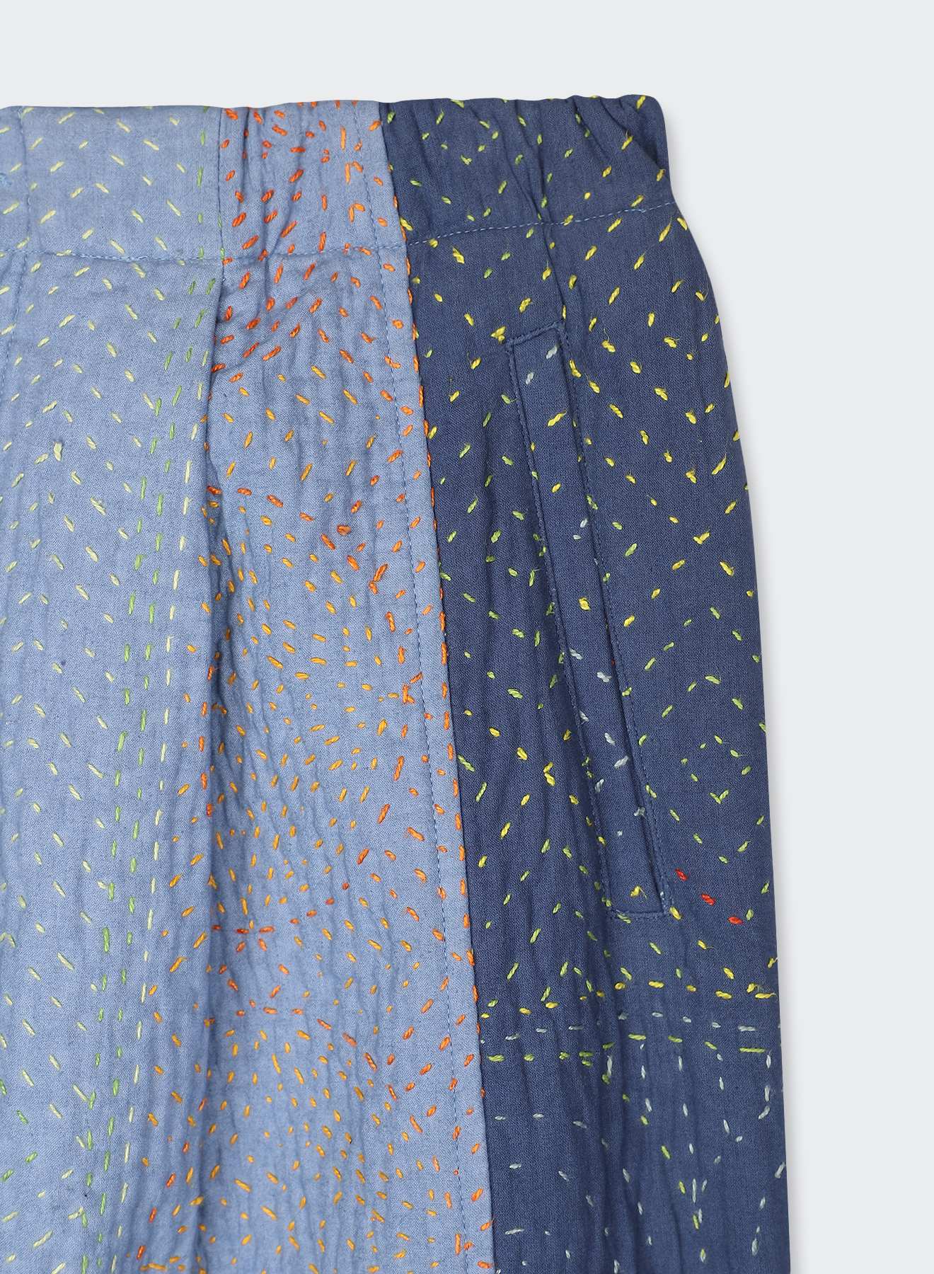 We work with cotton panels that have been overdyed before being joined into garments, each one embroidered in the kantha tradition. The stitching is done by hand in a simple running line, often carried from memory rather than a marked pattern. It binds the layers with strength while leaving a raised surface that changes how the cloth catches the light, bringing dimension to the fabric as it is worn.