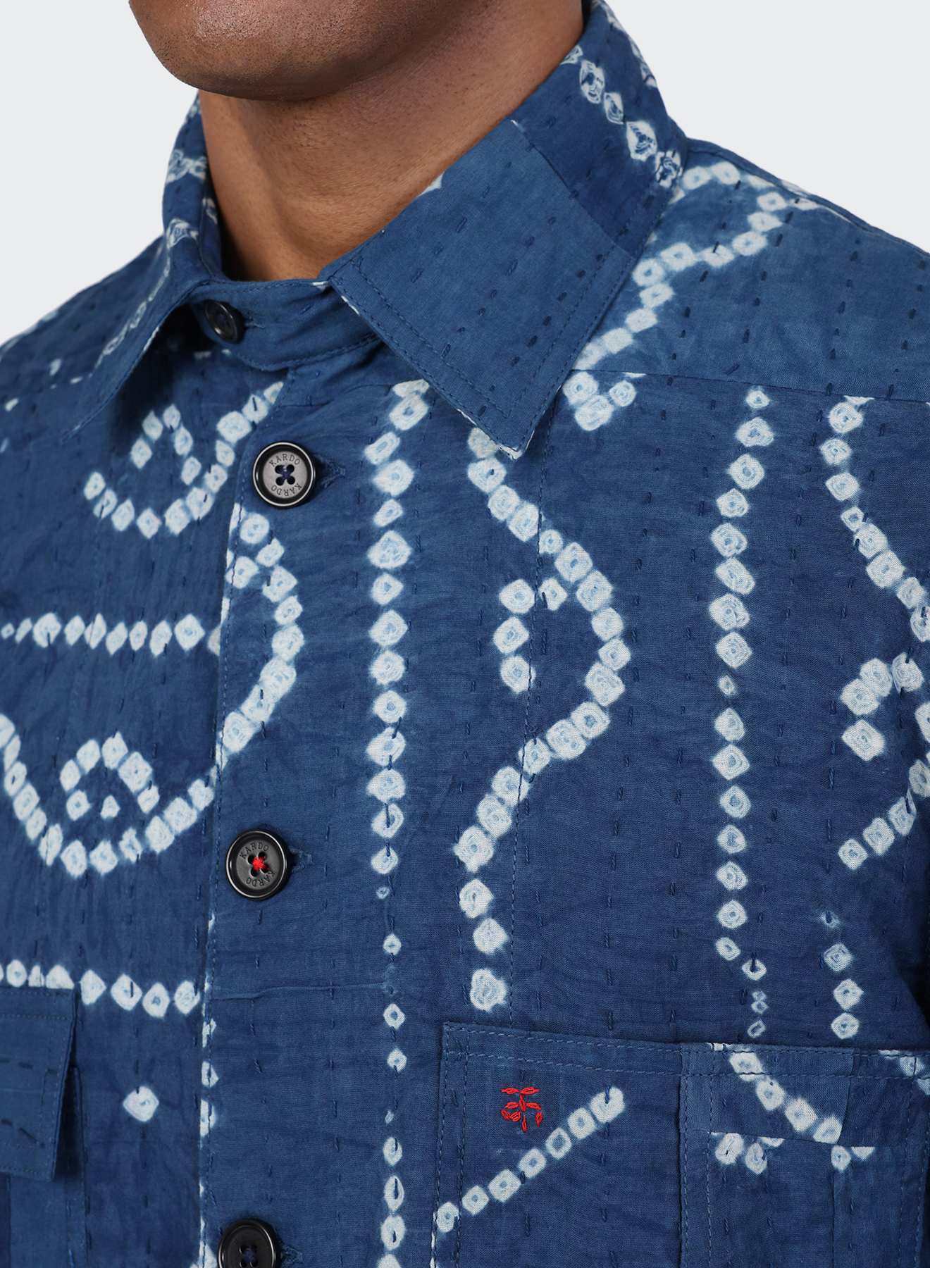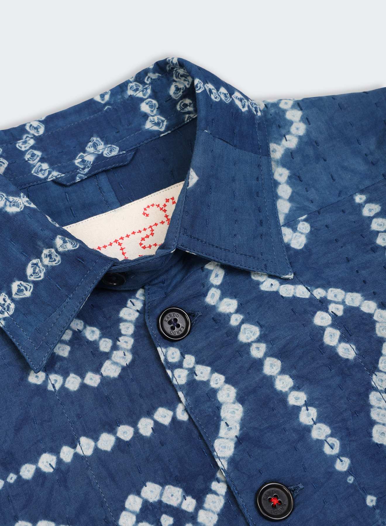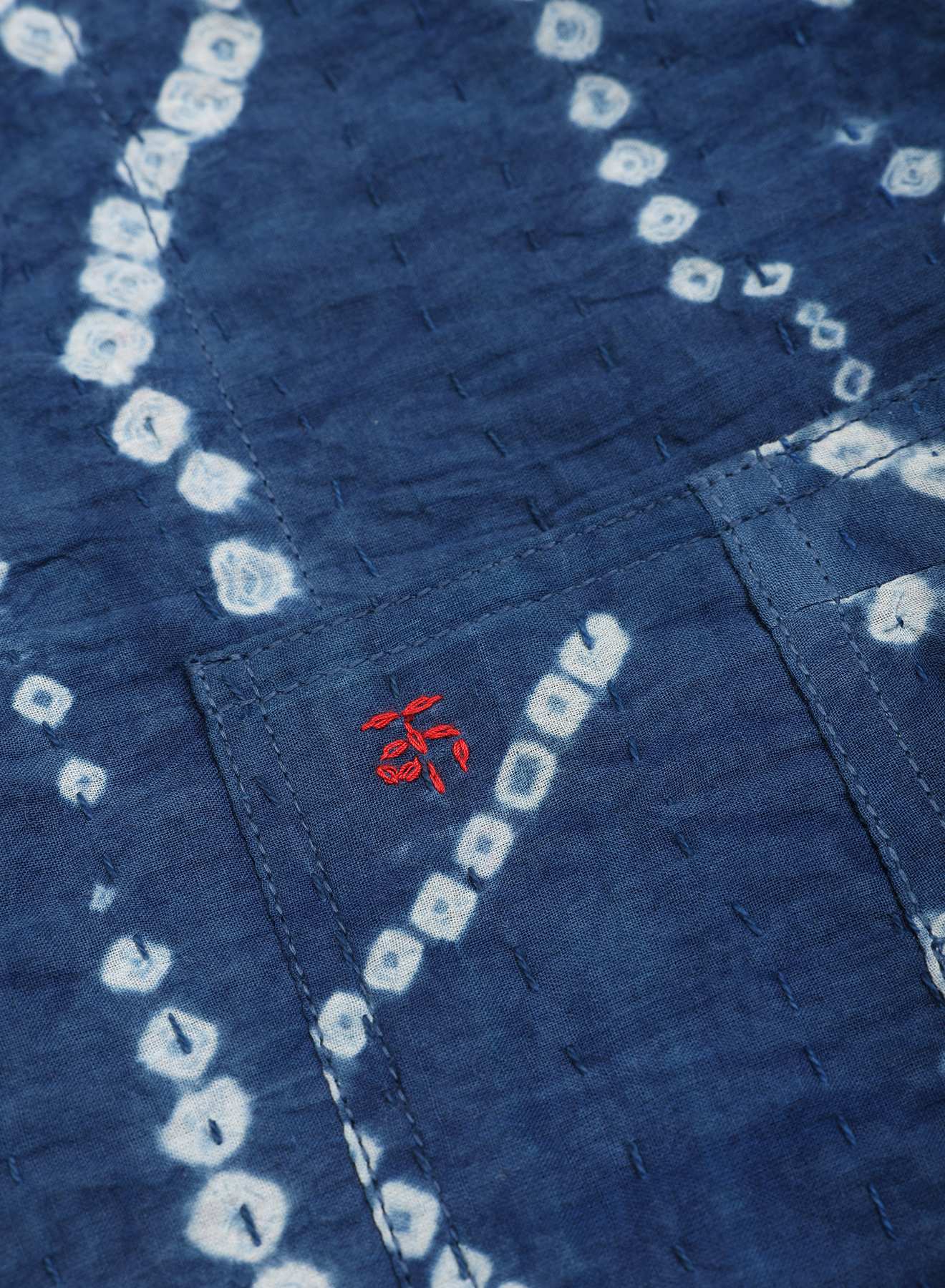 Bandhani, derived from the Sanskrit word ‘Banda’ meaning ‘to tie,’ is a skilled dyeing technique where fabric is tightly hand-tied at multiple points to create intricate patterns. This slow process uses only natural dyes.These patchwork pieces are crafted by fabric created by Suraj Narayan Titanwala and his family in Bagru, Rajasthan, renowned natural dye artisans who can trace their artistic lineage over 500 years. In addition, these pieces feature hand-embroidered kantha stitch detailing.